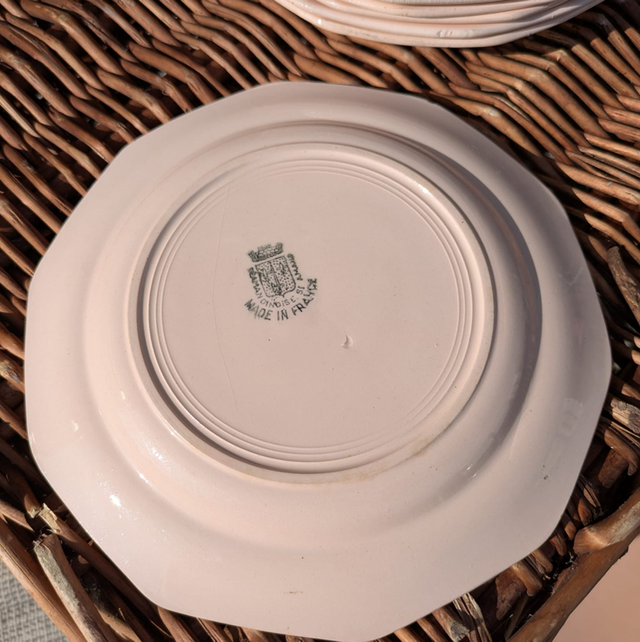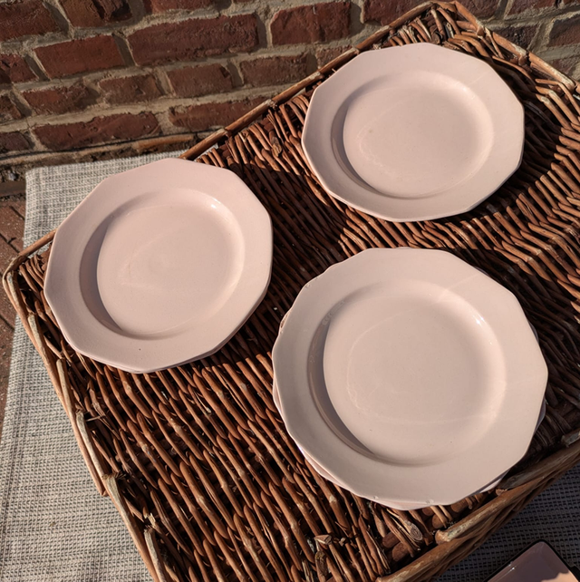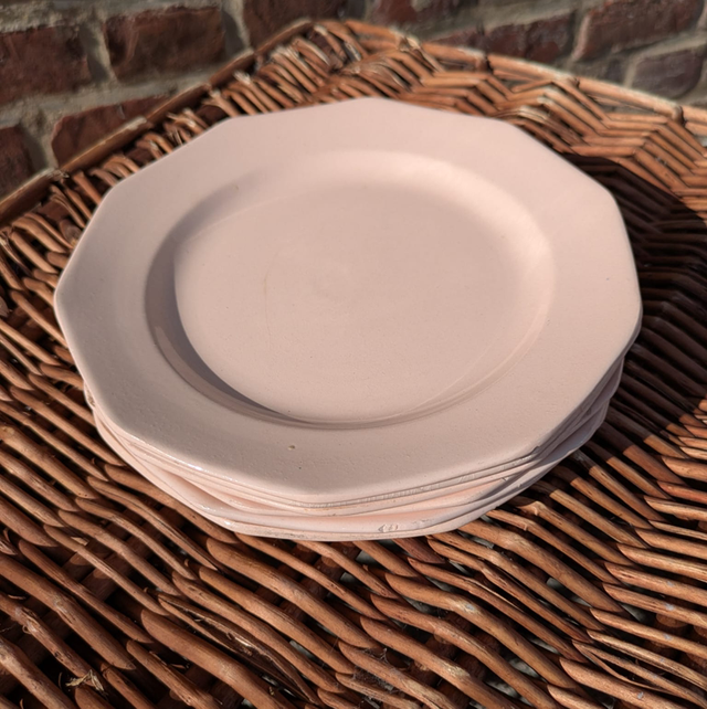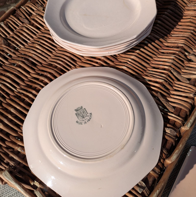 Assiettes à dessert octogonales de couleur rosé portent des traces du temps et gage d’ancienneté