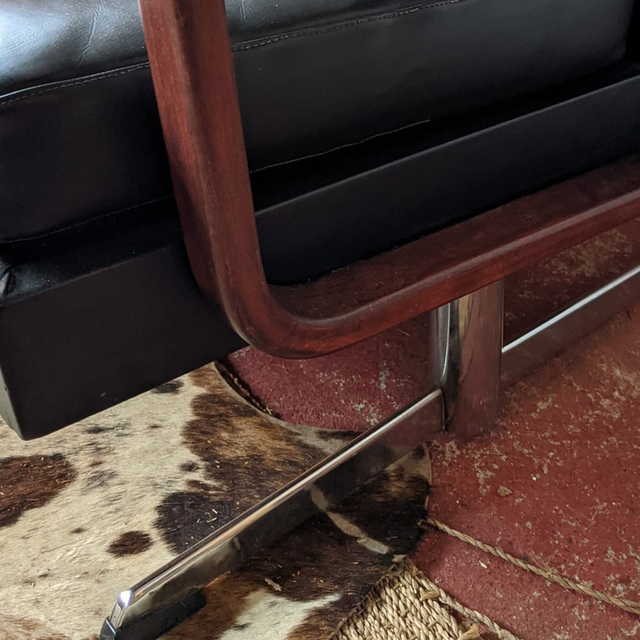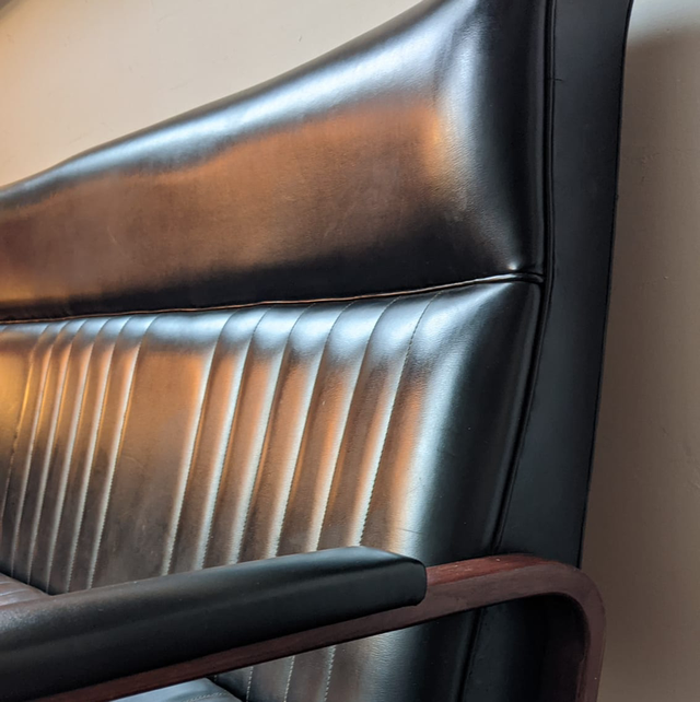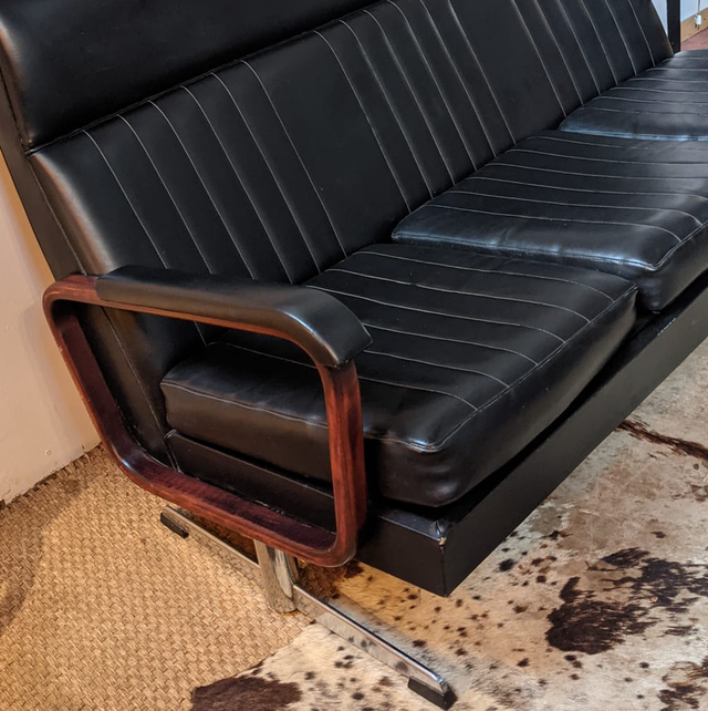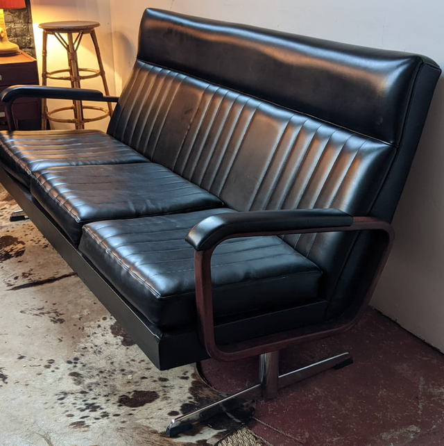 Belle banquette ancienne vintage au possible, très caractéristique des années 70, en Skaï noir avec des accoudoirs. En très bon état et très confortable. Il y a juste un leger trou sur le dossier à l’arrière comme vu dans une des photos.