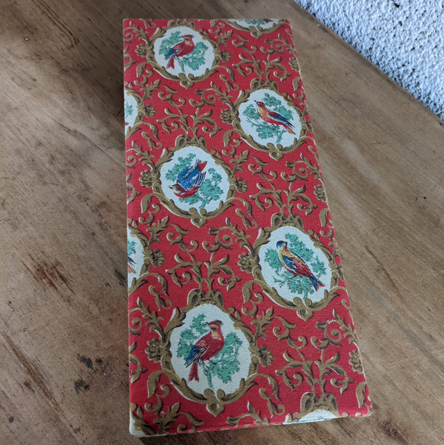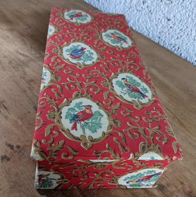 Boîte vintage en bois recouverte de tissu. Ce genre de boite date des années 60 et servait de boîte à couture.