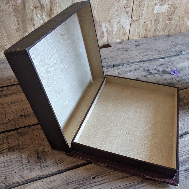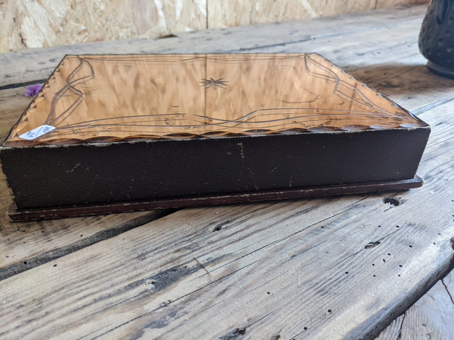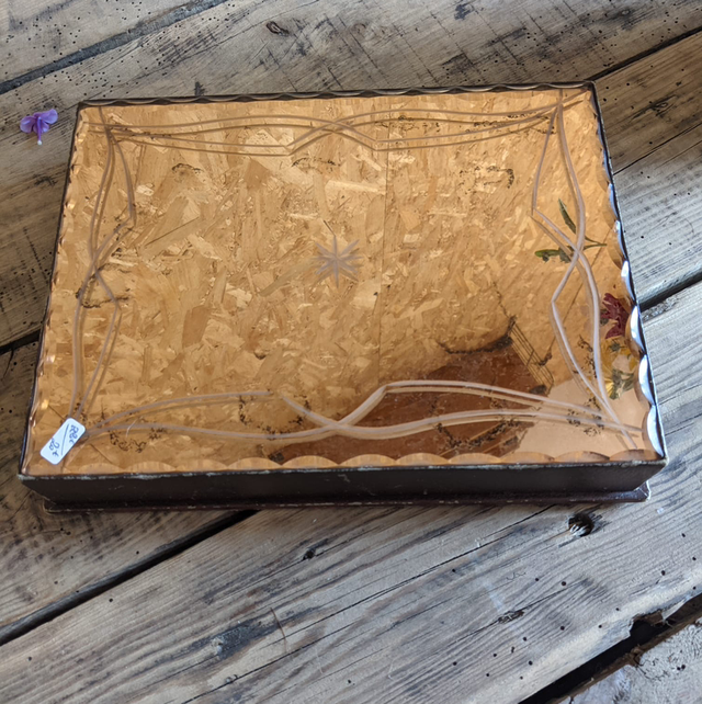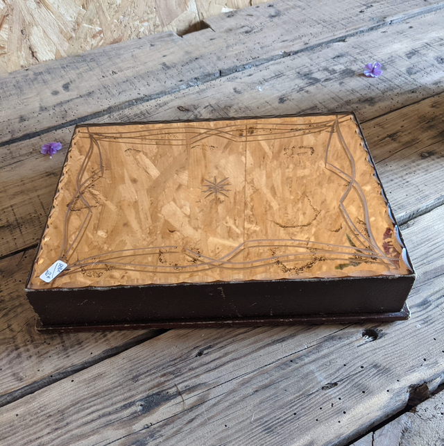 Petite boîte fine des années 30, recouverte d’un miroir rosé et le contour est en carton. Elle s’ouvre pour laisser apparaître un petit casier. Elle Peut servir de boîte à bijoux