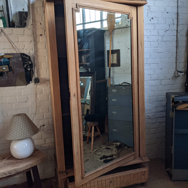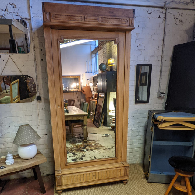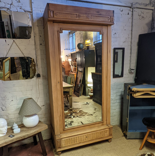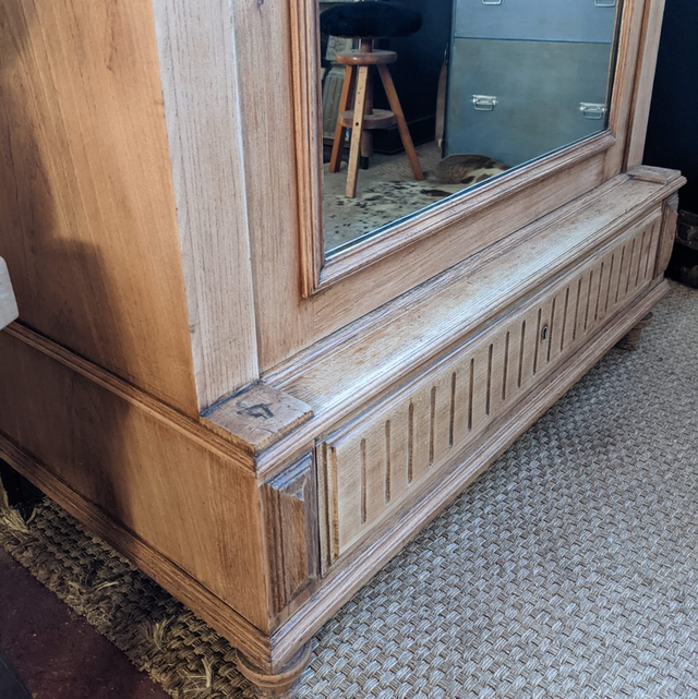 son miroir piqué porte les traces du temps, elle possède un tiroir en bas et une belle corniche qui se pose tout simplement au dessus car elle se démonte en plusieurs partie.a l’intérieur il y a des planches ce qui offre de multiples rangements.