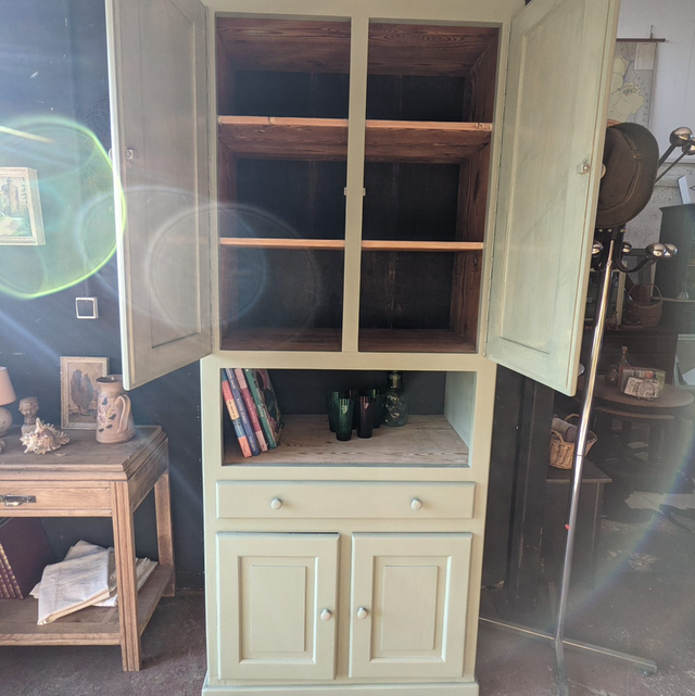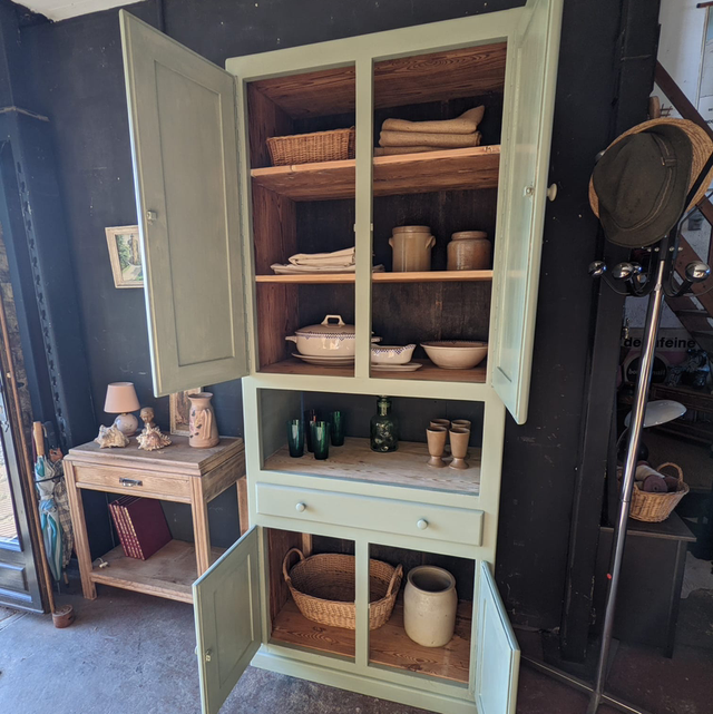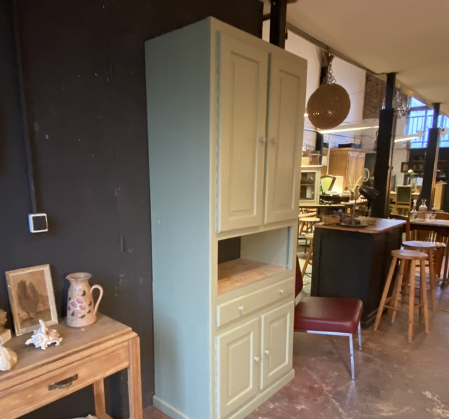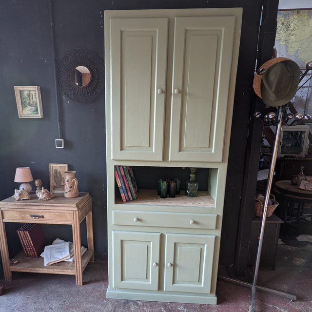 ce joli meuble unique a été repeint avec un vert sauge hyper tendance et à la mode qui en fait un meuble original et neutre pouvant s’allier avec tout type de décoration.