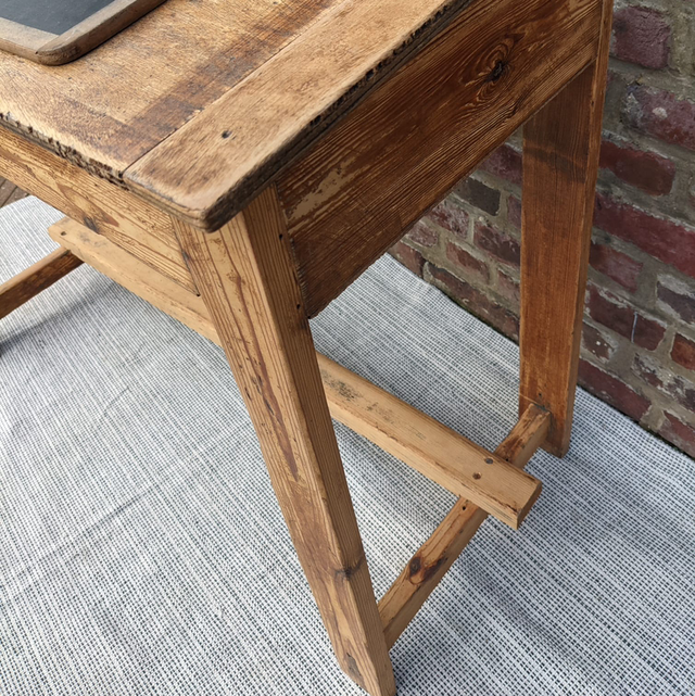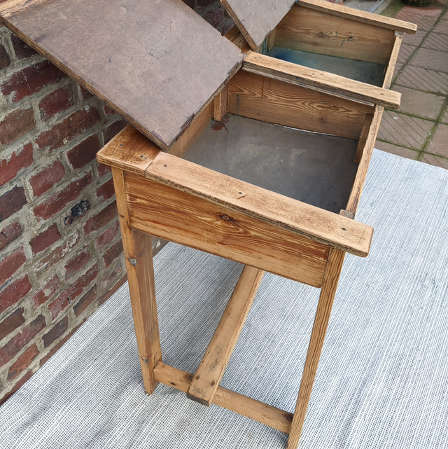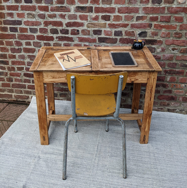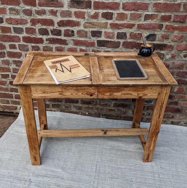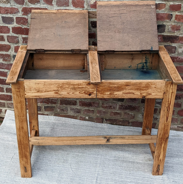 Petit bureau d’école 2 places avec la planche du dessus qui se soulève afin de ranger différents accessoires. Léger et fin ce bureau est très pratique à mettre dans de petites pièces.