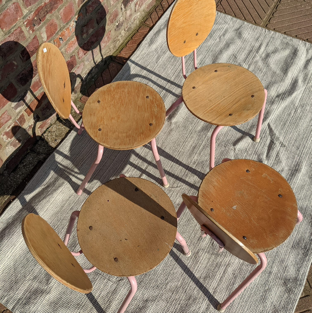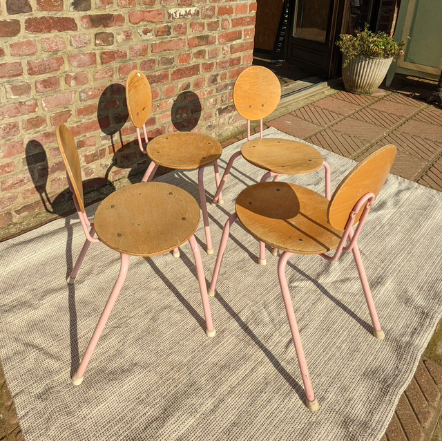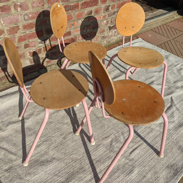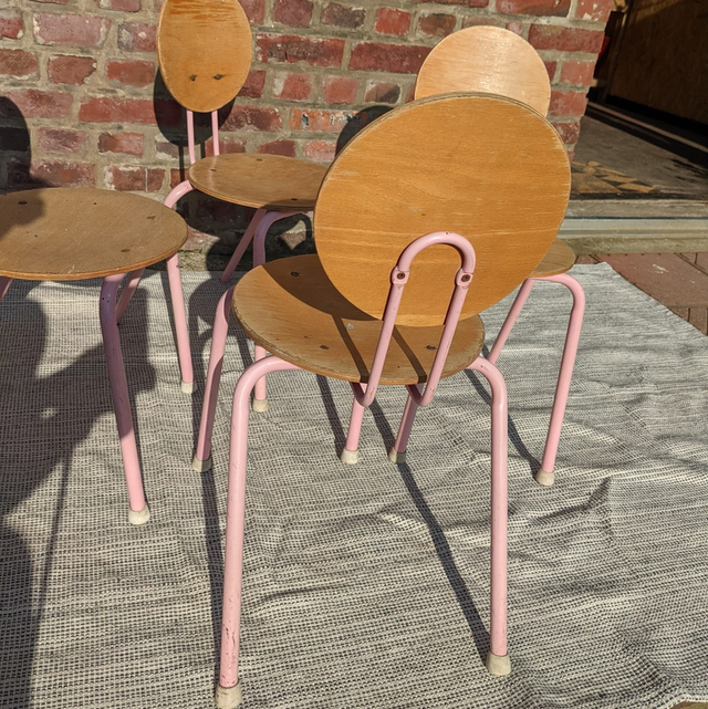 Chaise enfant (vendu à l’unité) pied en métal peint en rose. Assise en bois rond et dossier rond, stylée et originale ce modèle est très mignon et peut se mettre avec une petite table d’école, un petit bureau d’enfant ou encore autour d’une table basse,