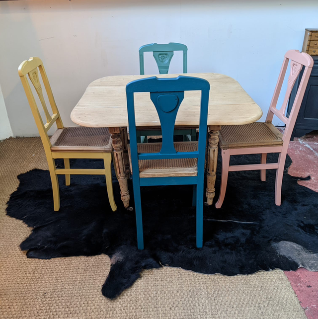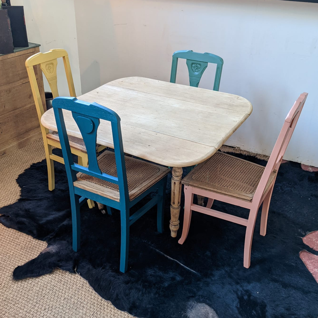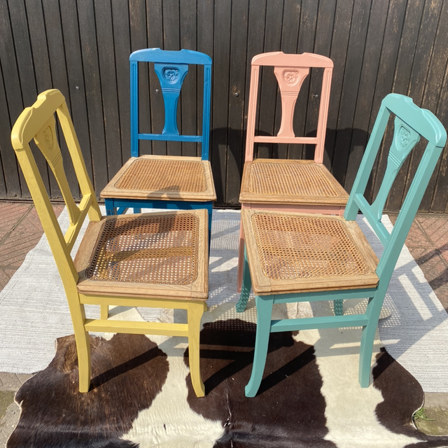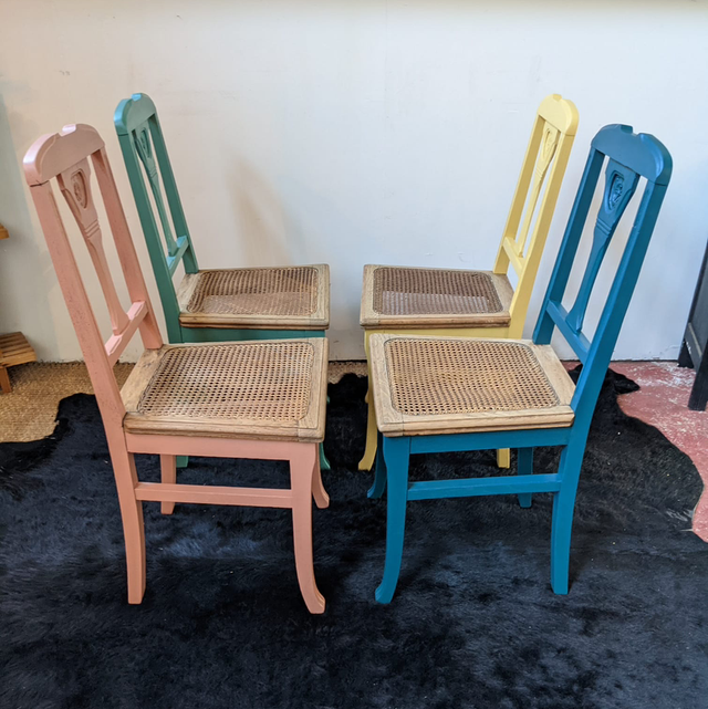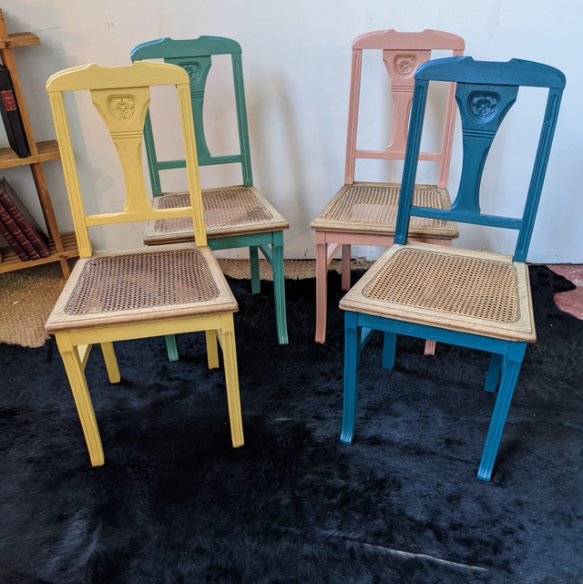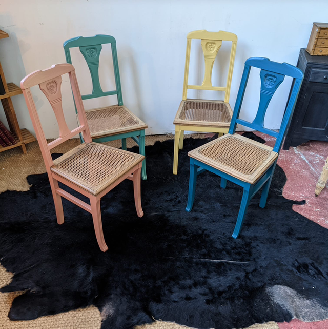 Ces chaises ont été entièrement retravaillées et repeintes afin de leur redonner une coup de fraîcheur et de modernité.