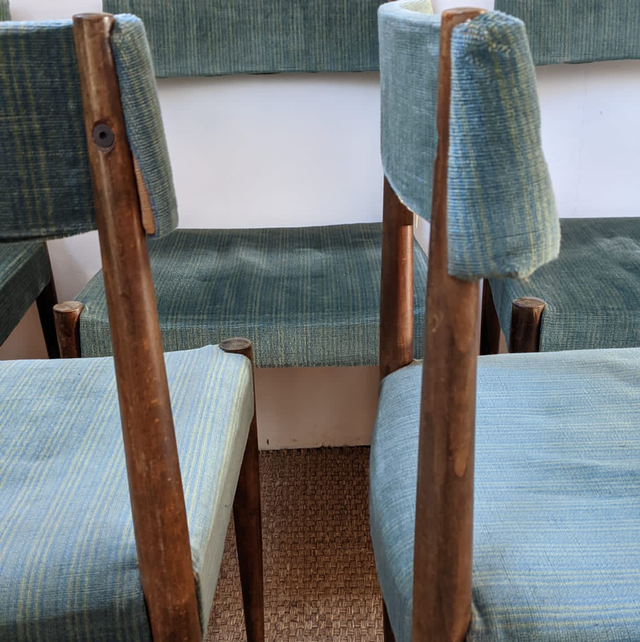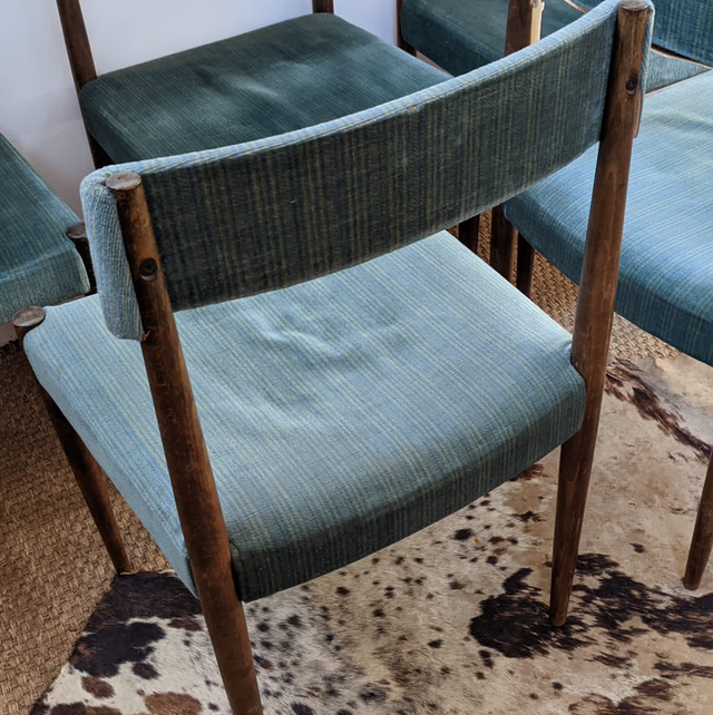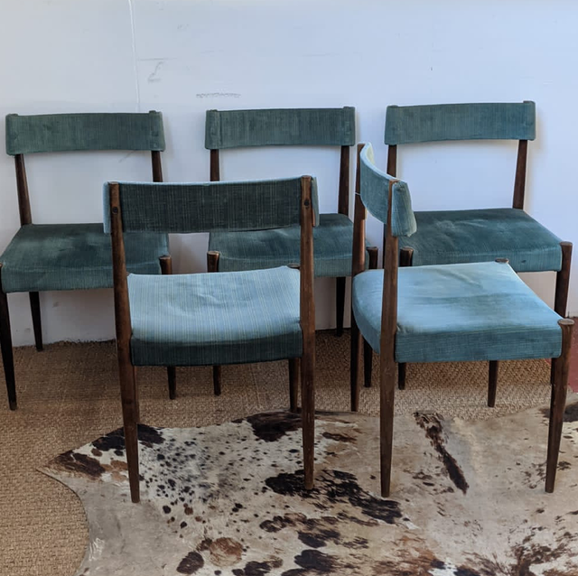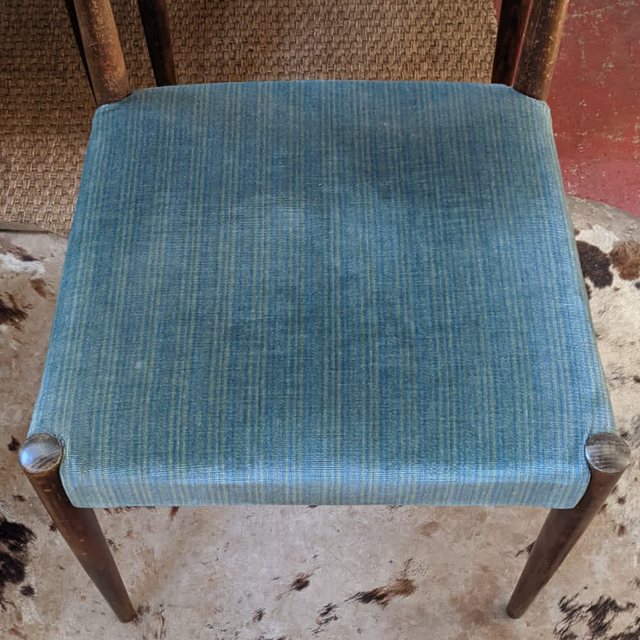 5 Très jolies chaises scandinaves (prix pour le lot) dans les tons bleus. Les pieds sont en bois marron foncés et solides. L’assise carré et en velours est très confortable on se sent très bien assis. Elles sont toutes en très bon état. Très harmonieuses et chaleureuses autour d’une table à manger, ces chaises trouveront leur place parfaitement dans votre intérieur.