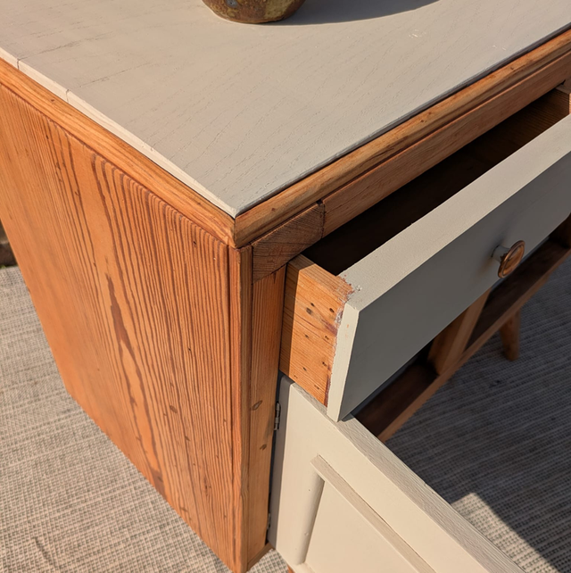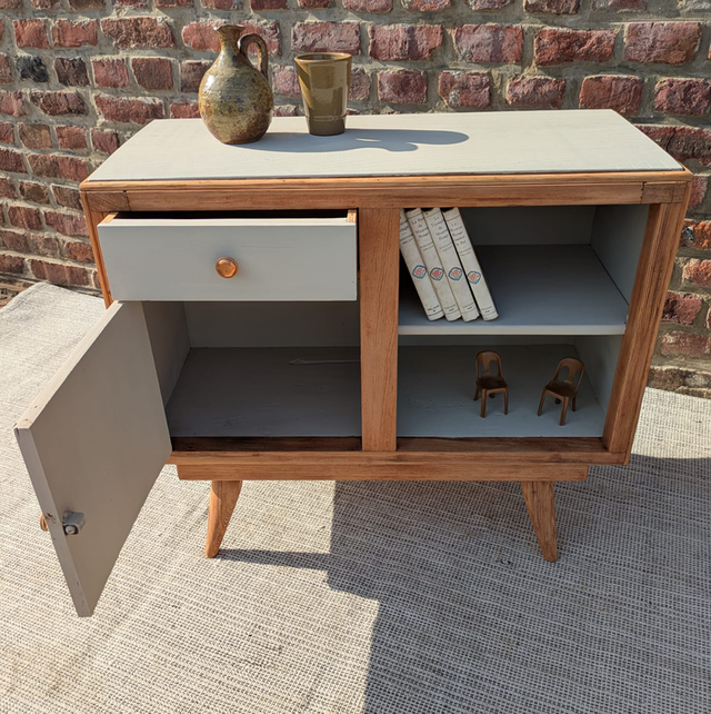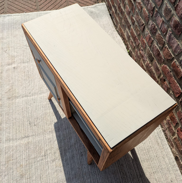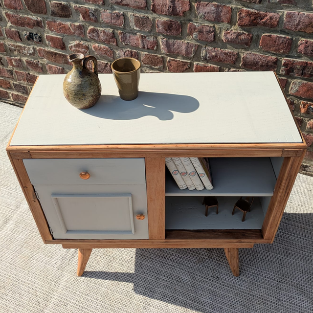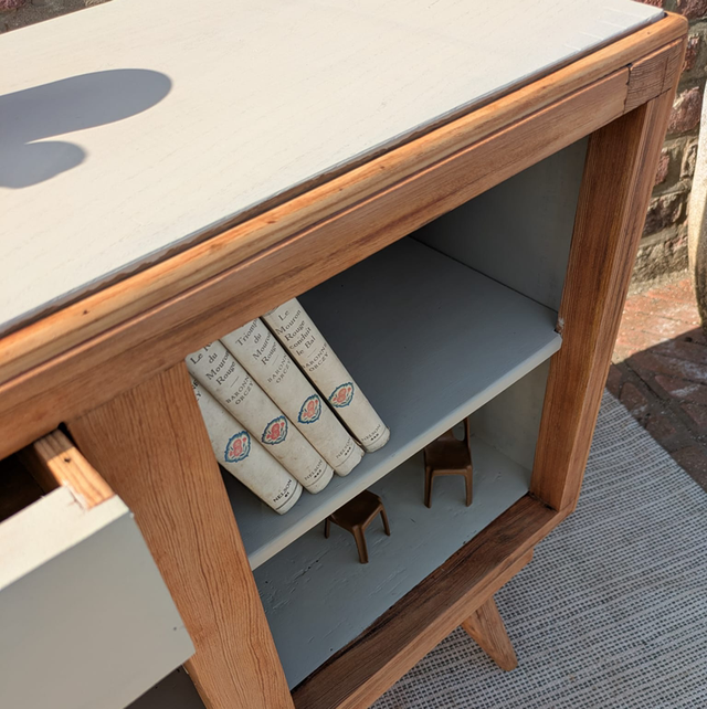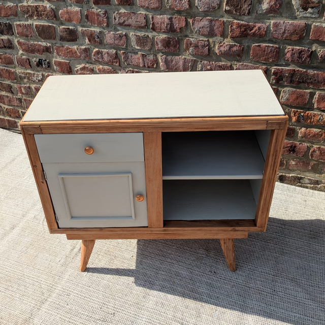 Ce petit chevet unique était doté à l'origine d'une une plaque de marbre typique des années 50 remplacée par une belle petite planche de bois intégrée sur le dessus et peinte dans une couleur neutre afin de le moderniser.