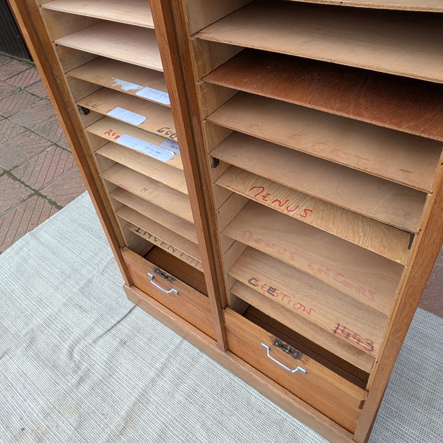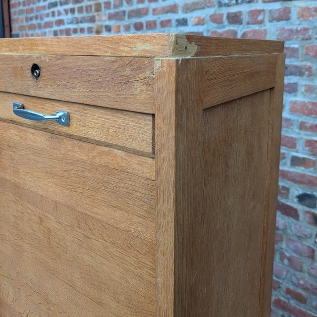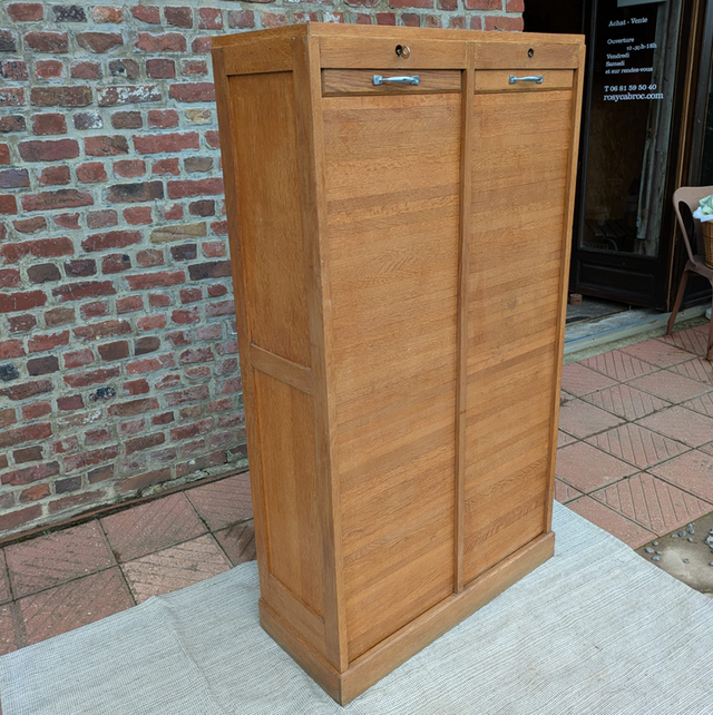 Authentique et chargé d’histoire, ce classeur à rideau « dit de notaire » en chêne clair date des années 1950. Emblématique du mobilier administratif d’après-guerre, il séduit par son allure sobre, fonctionnelle et son élégance intemporelle. Son rideau coulissant, caractéristique de ce type de meuble, permet de dissimuler facilement documents, dossiers ou objets, tout en optimisant l’espace grâce à une ouverture sans débattement. Idéal dans un bureau, un salon ou un intérieur au style vintage, industriel ou mid-century, ce meuble de caractère trouve aujourd’hui une seconde vie comme rangement, bibliothèque ou meuble d’appoint. Un meuble rare et fonctionnel, alliant histoire, qualité artisanale et esthétique vintage.
