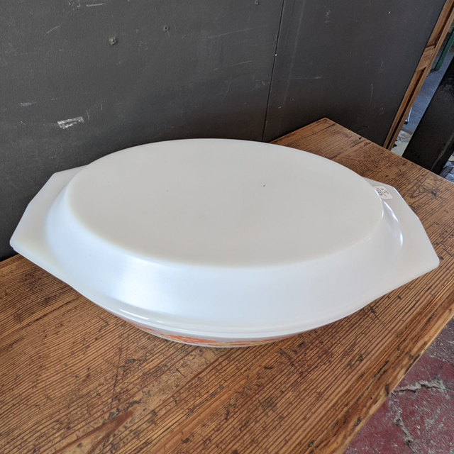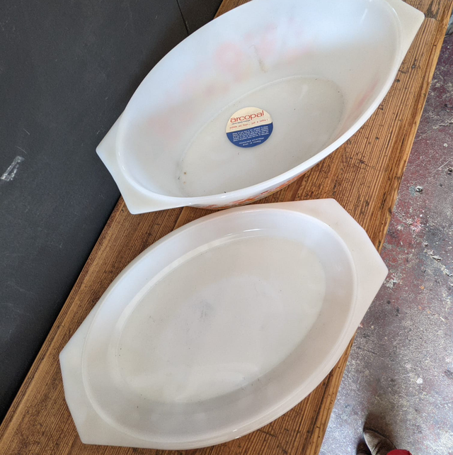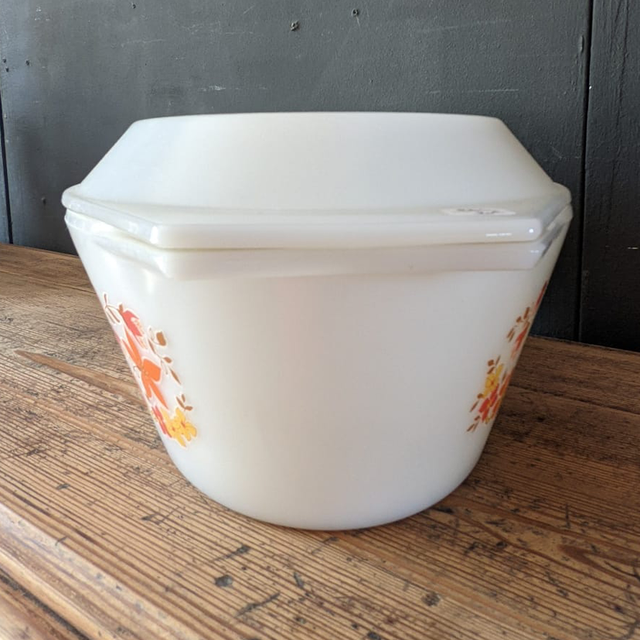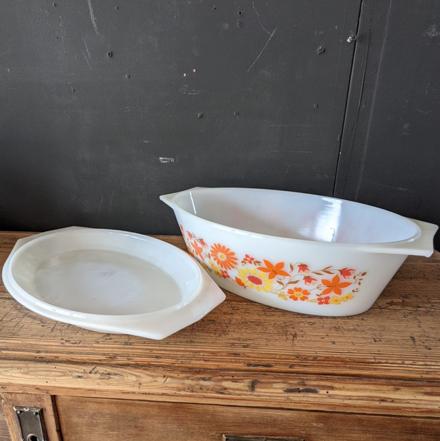 Cocotte en arcopal opaque des années 70, modèle fleuri scania,