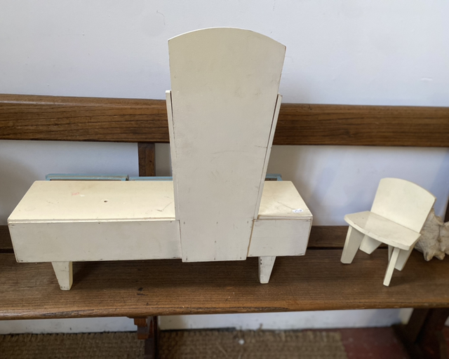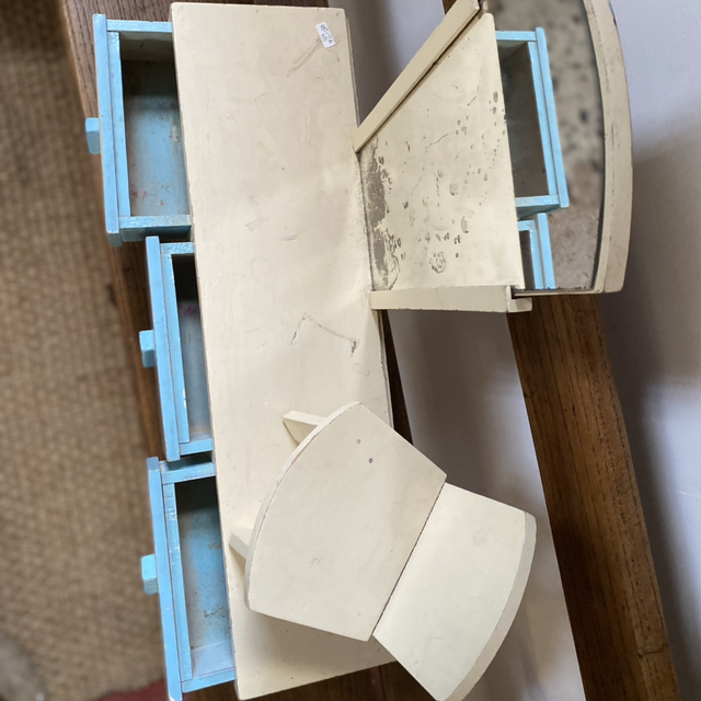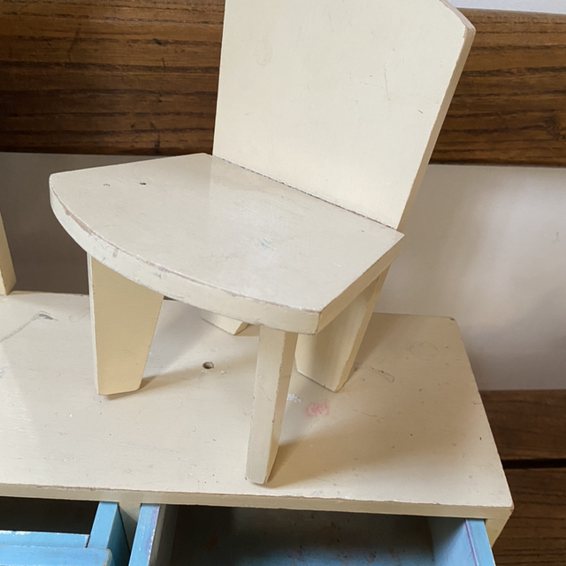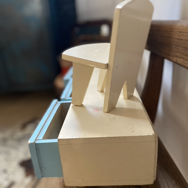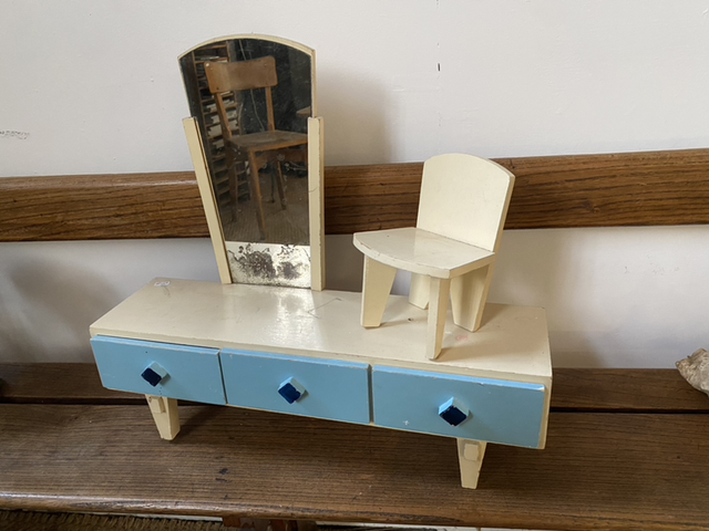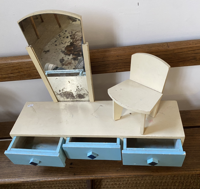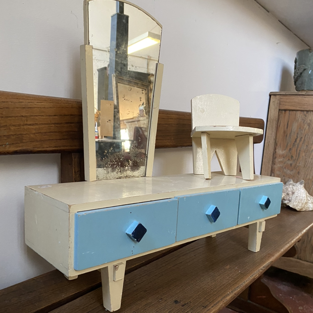 Jolie petite coiffeuse vintage en bois, avec 3 petits tiroirs peints en bleus, sa petite chaise beige, Un mignon petit miroir piquée qui preuve l’ancienneté de ce produit.