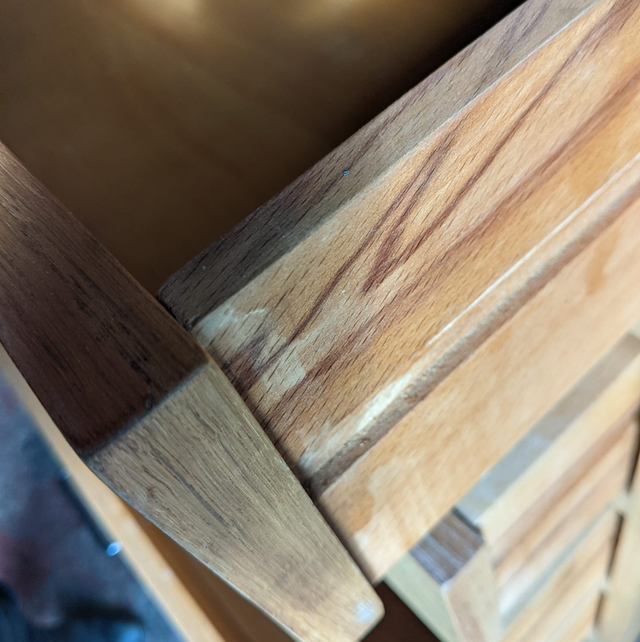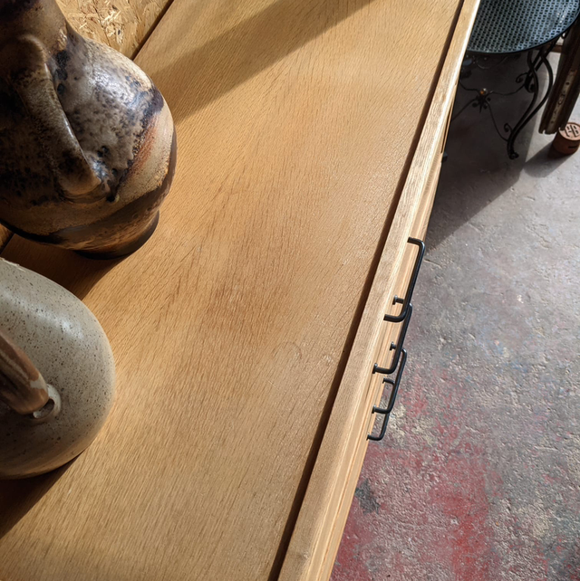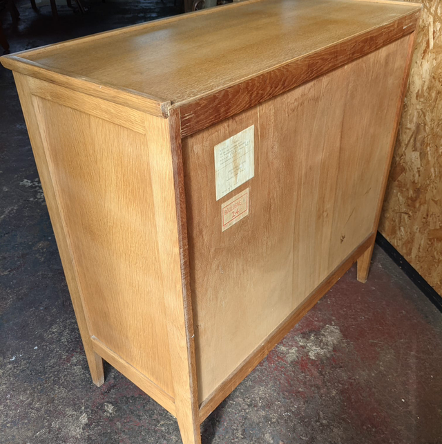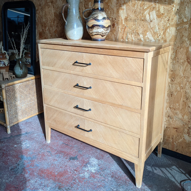 commode vintage des années 1960. En chêne et plaquage chêne. Ses pieds dit compas sont similaires aux meubles scandinaves, Les poignées en métal laqué noir sont d’origine. Les 4 tiroirs coulissent bien sans besoin de forcer. Le plateau ainsi que les façades des tiroirs sont en plaquage chêne comme beaucoup de commodes de cette époque. Sa couleur miel est neutre et peut trouver sa place dans toutes les pièces de la maison et son association avec d’autre style de meuble peut être harmonieux.
