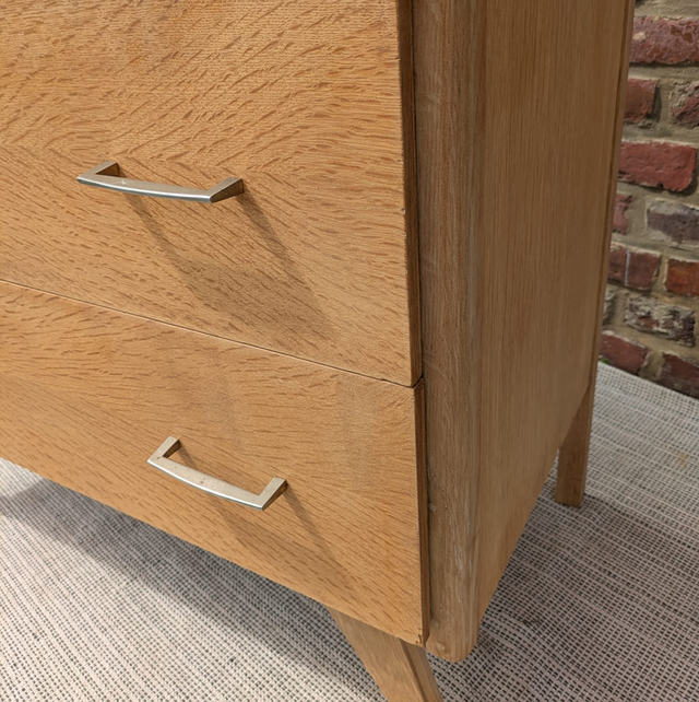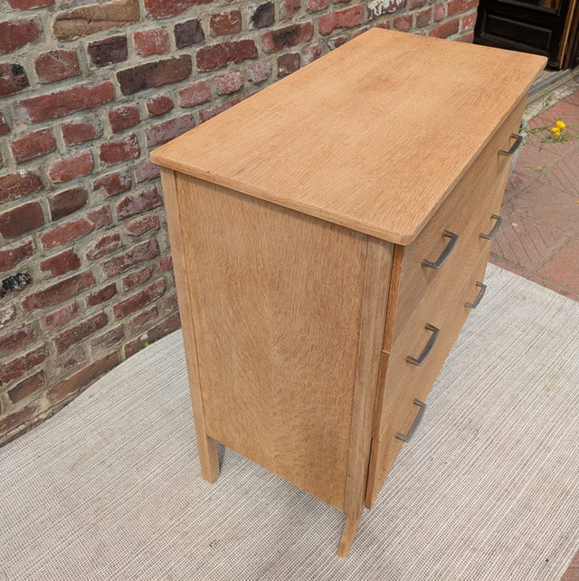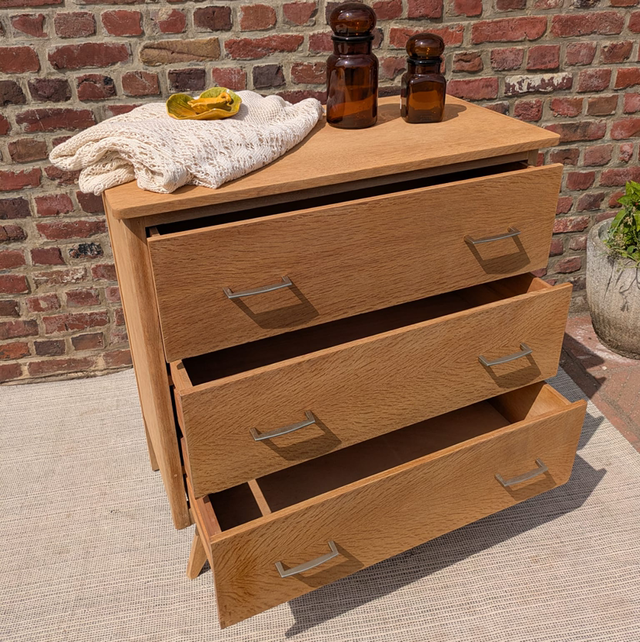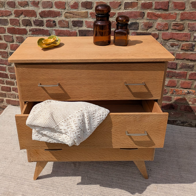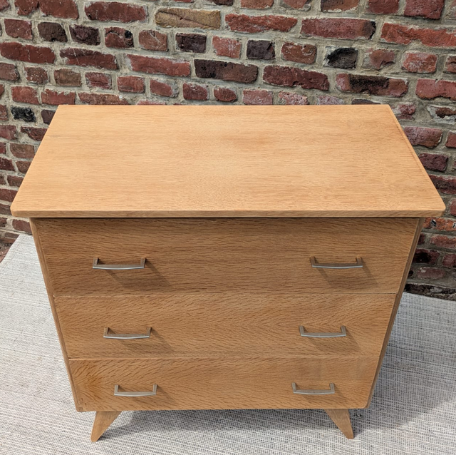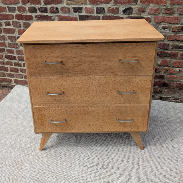 Commode 3 tiroirs plaquage chêne esprit scandinave. Datant des années 60 cette commode couleur bois clair neutre idéale à positionner dans toutes les pièces de la maison pourtant se fondre dans tout type de décor.
