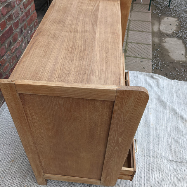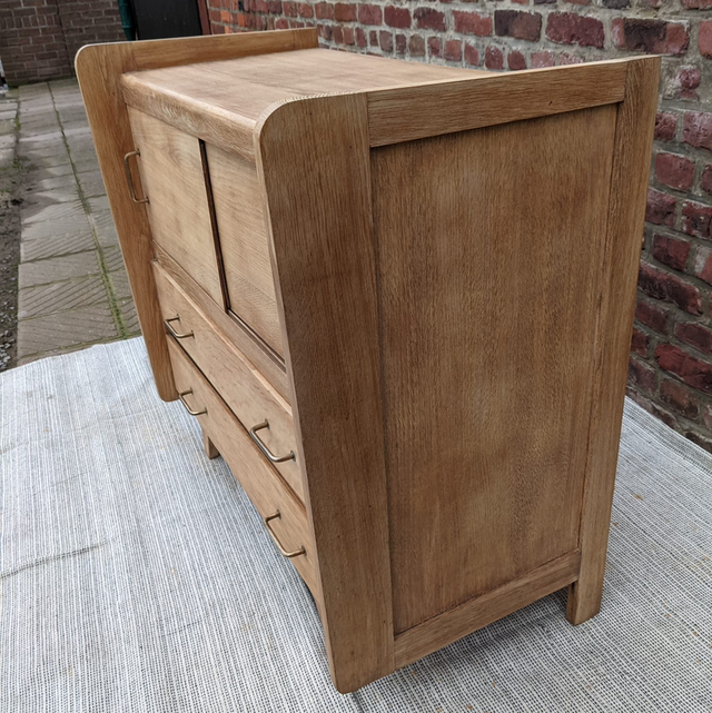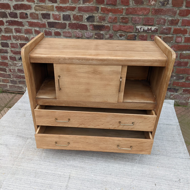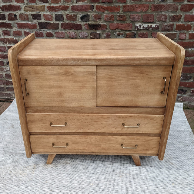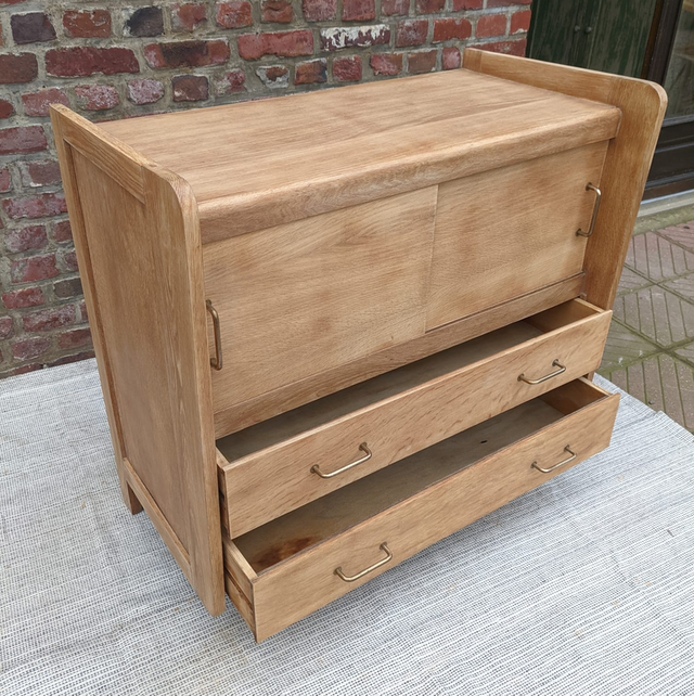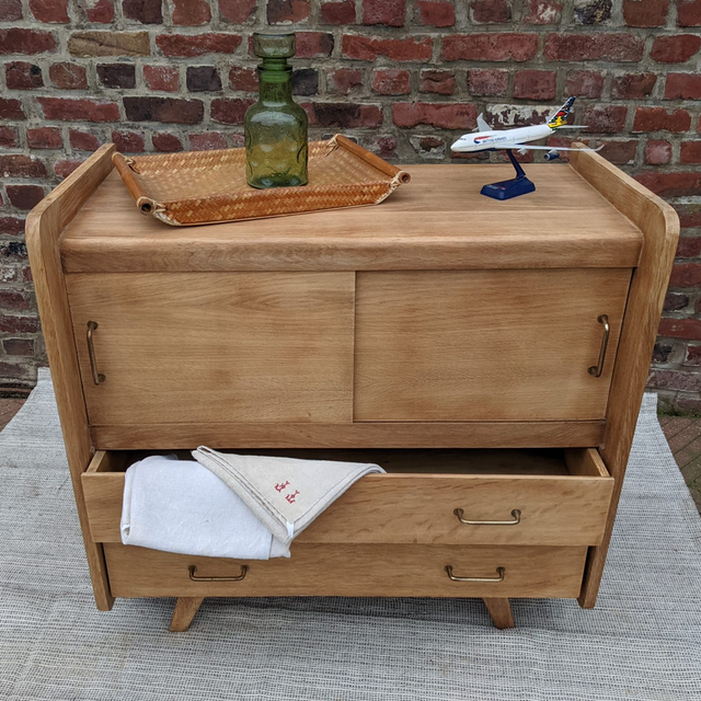 Commode vintage années 50 en plaquage chêne. Elle possède 2 tiroirs en bas et 2 portes coulissantes.