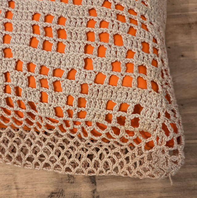 Découvrez ce coussin en crochet à la fois stylé et confortable. La housse en fil beige est ornée de motifs géométriques sur un fond orange vif, apportant une touche de couleur à votre intérieur. Idéal pour le salon ou la chambre, il s'intègre facilement dans divers styles de décoration. Ne manquez pas cette pièce unique pour embellir votre espace.