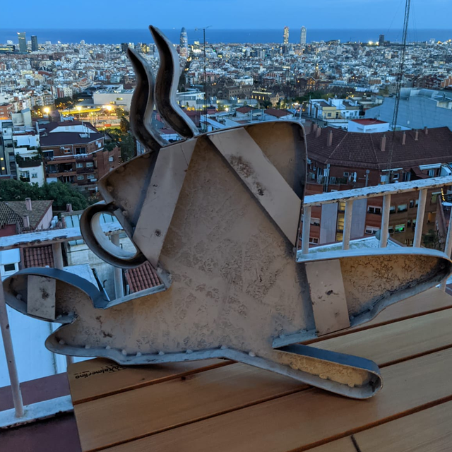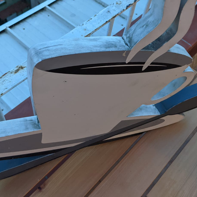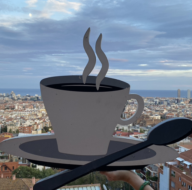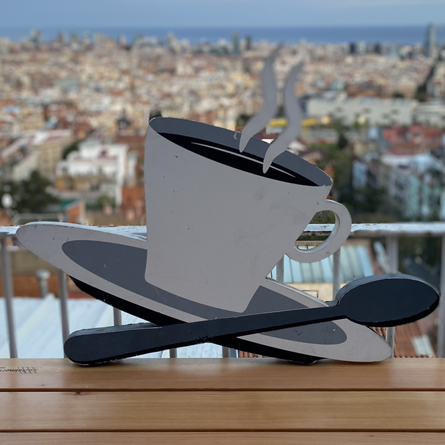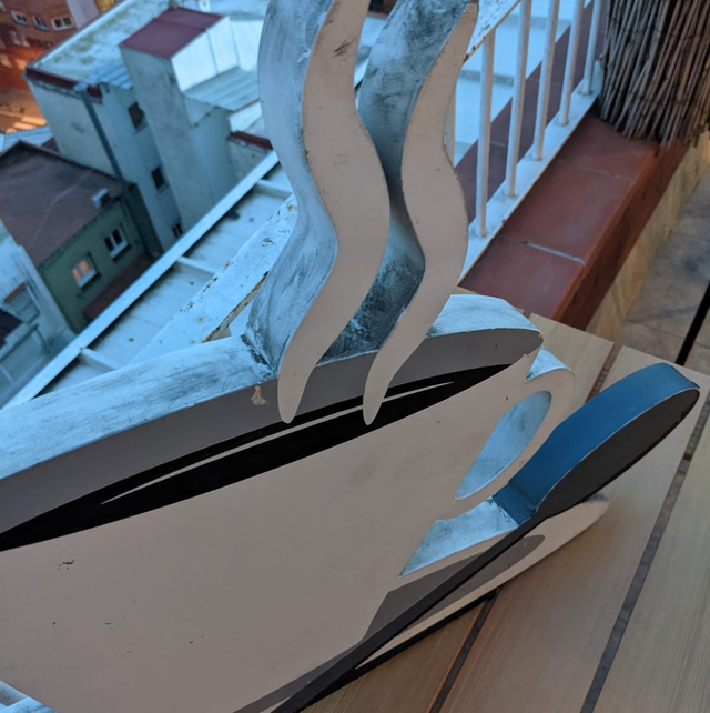 Vieille enseigne de magasin en métal une tasse de café avec la cuillère dans les tons gris blanc et noir, qui peut s’accrocher au mur idéal pour une deco sympa dans une cuisine ou même dans un salon.