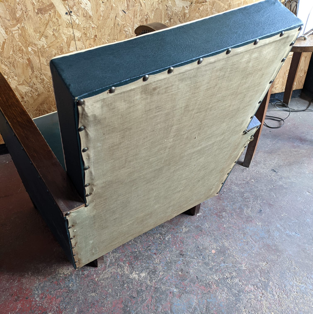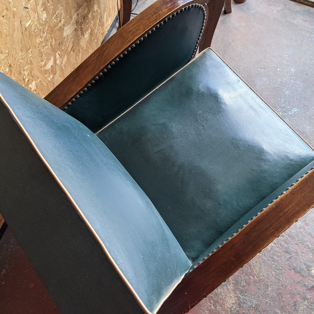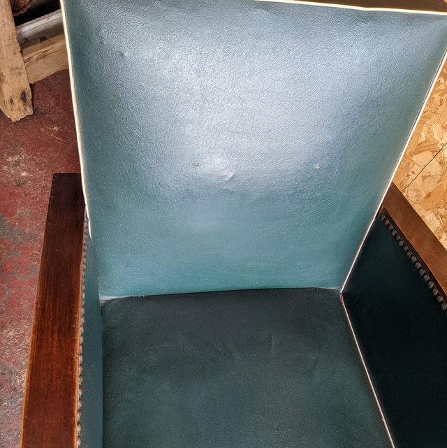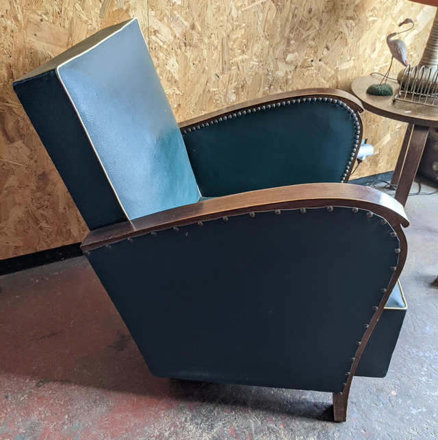 Ancien fauteuil des années 30, en Skaï vert foncé et avec accoudoirs en bois.