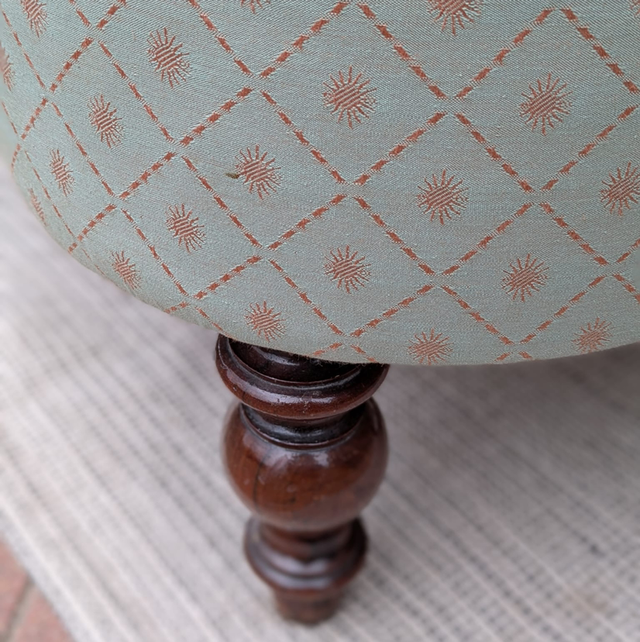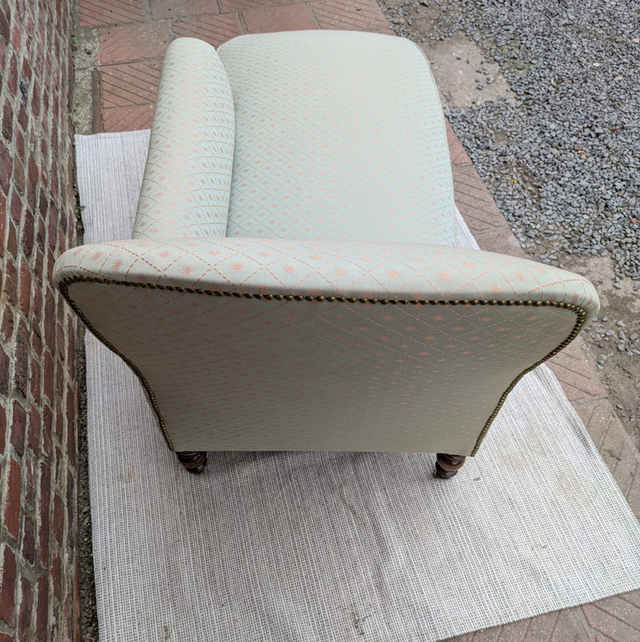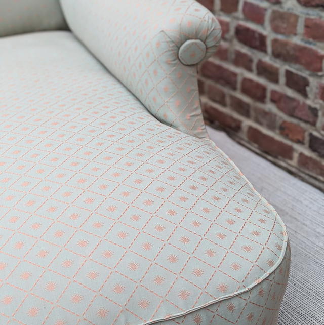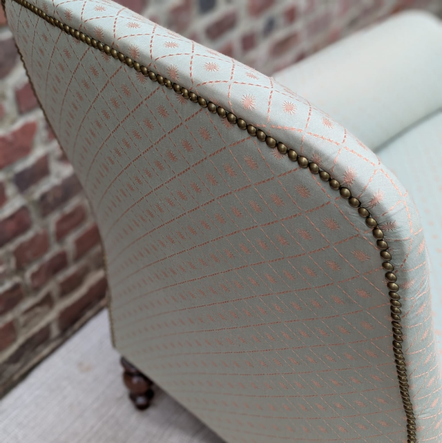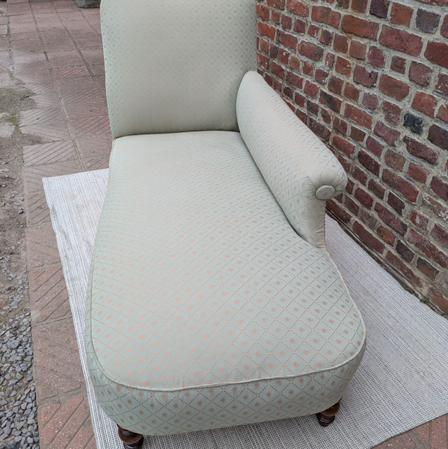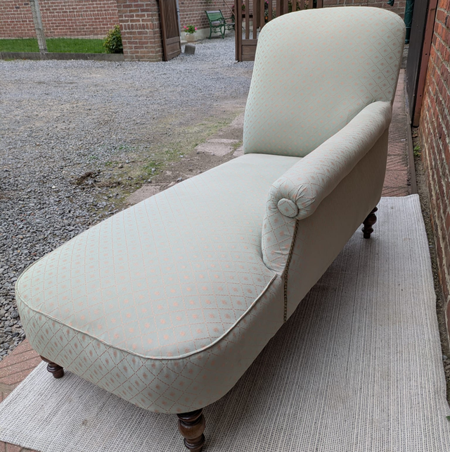Très belle méridienne / banquette napoleon 3 entièrement restaurée et très bien faite avec les clous tapissiers le tissu est impeccable et d’un beige crème avec un petit losange et soleil tout eu long du tissu de couleur doré.