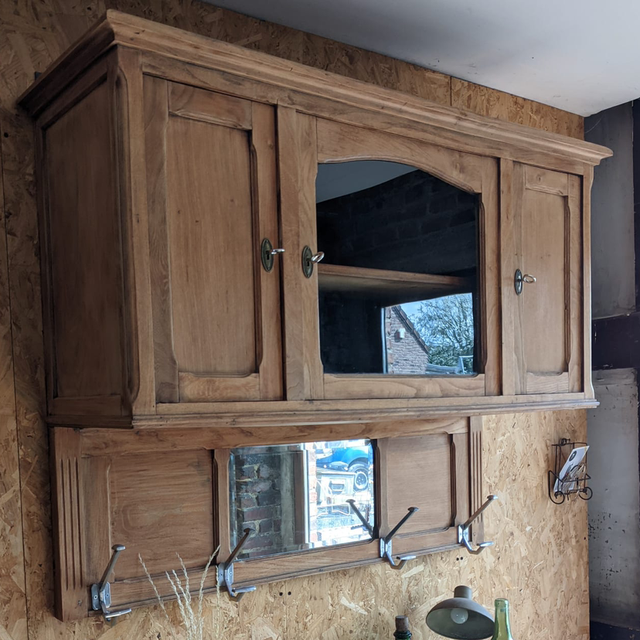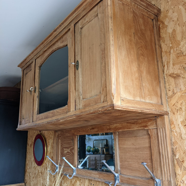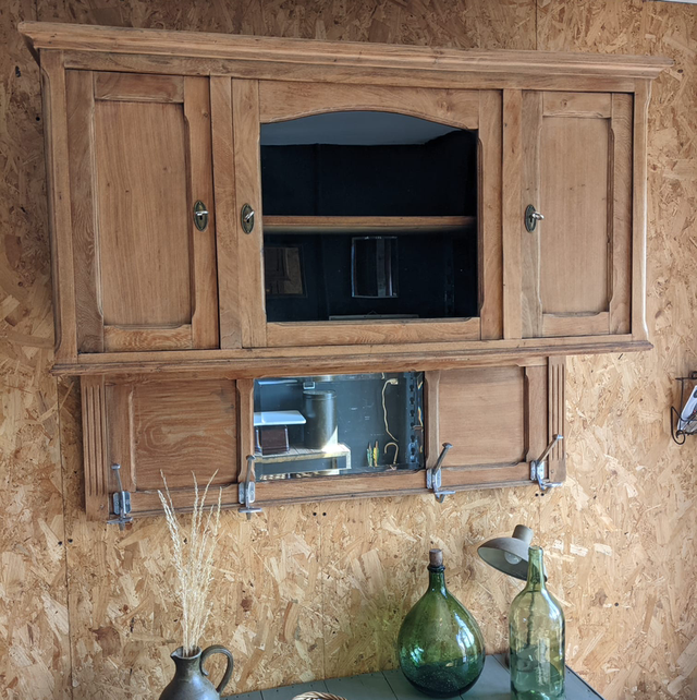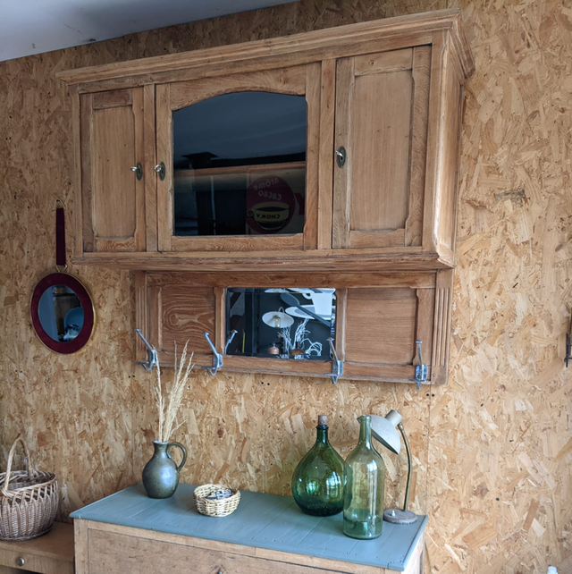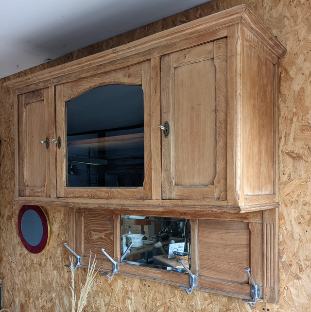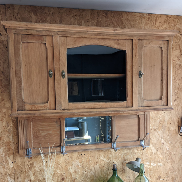 Meuble haut à suspendre, il s’agit en fait de la partie haute d’un meuble 2 corps que nous avons retravailler afin de lui donner une seconde vie.