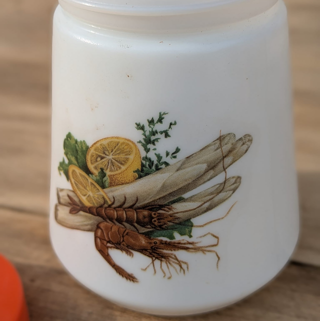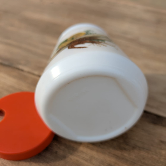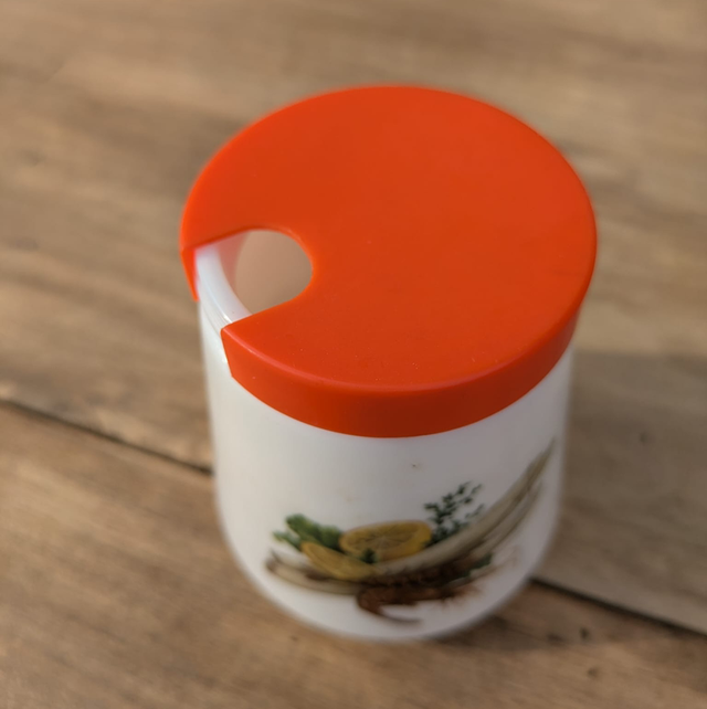 Petit moutardier en arcopal avec couvercle en plastique pouvant laisser passer une petite cuillère.