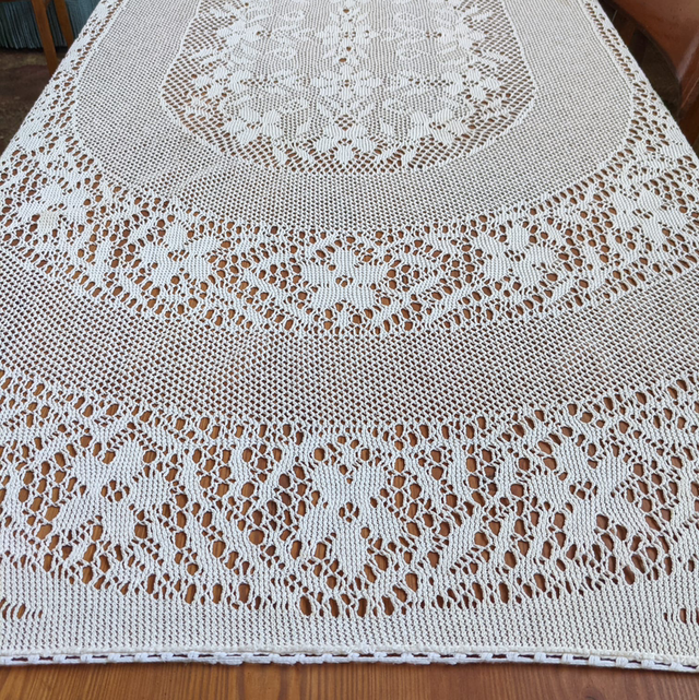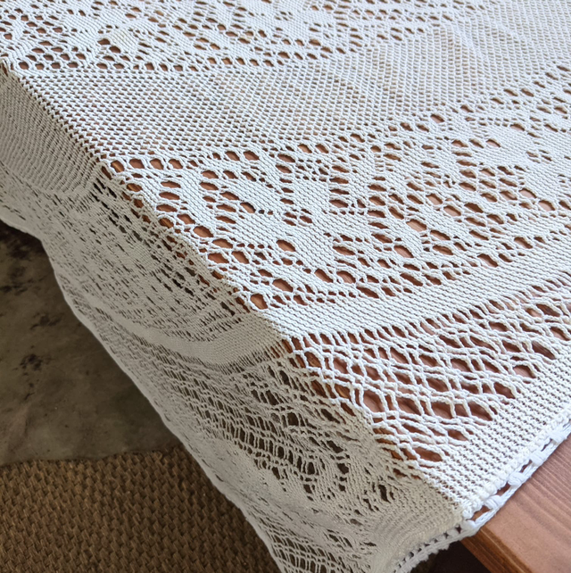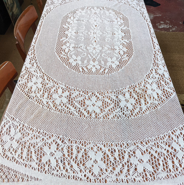 Très jolie nappe en crochet pas du tout abîmée pas de trou. Elle est en parfait état.