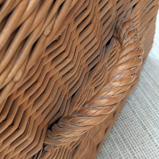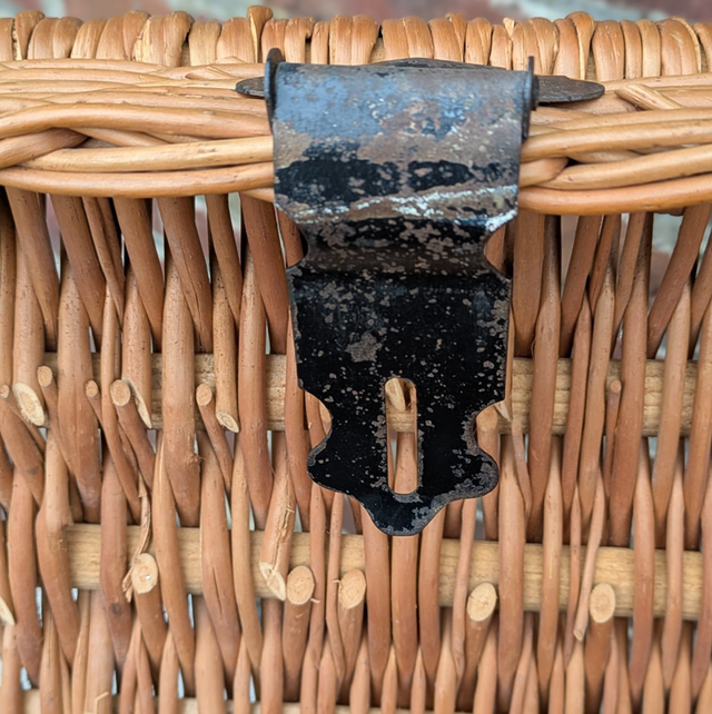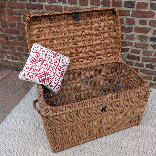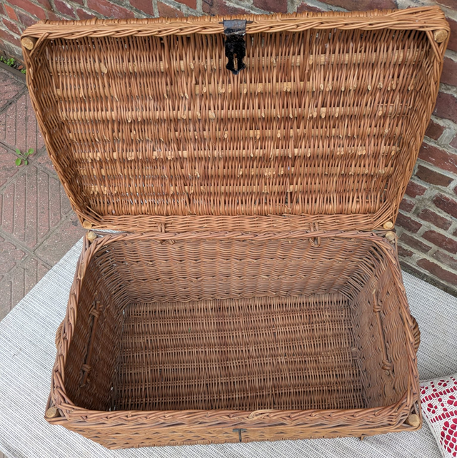 grand panier coffre en osier pouvant servir de grand rangement car il est profond. En très bon état avec une fermeture en métal.