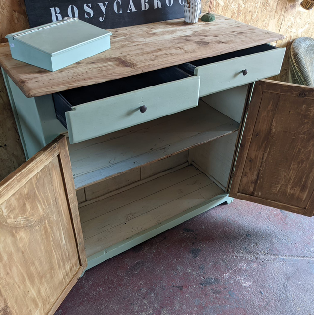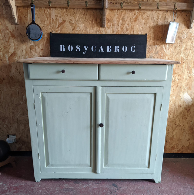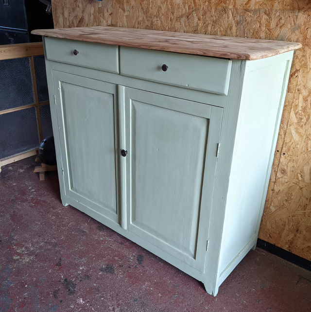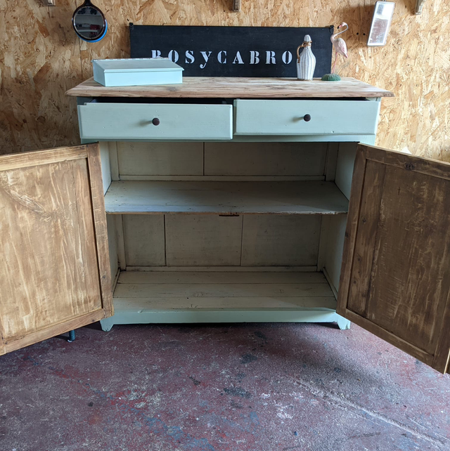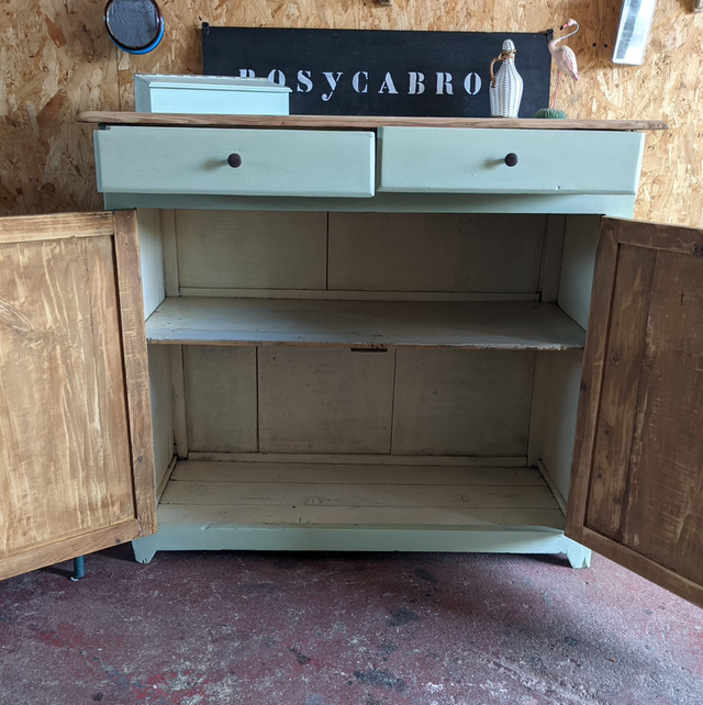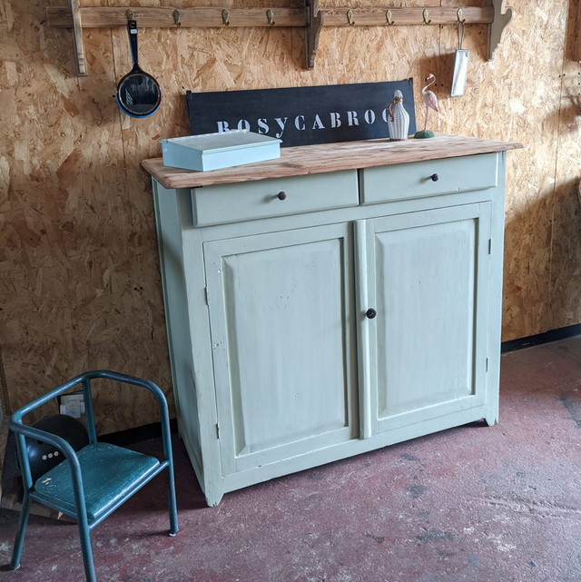 Jolie buffet appelé « parisien » peint avec d’une couleur vert d’eau, le plateau couleur bois, ce meuble a été refait entièrement par nos soins. L’intérieur a été repeint en blanc pour un effet propre et uniforme.