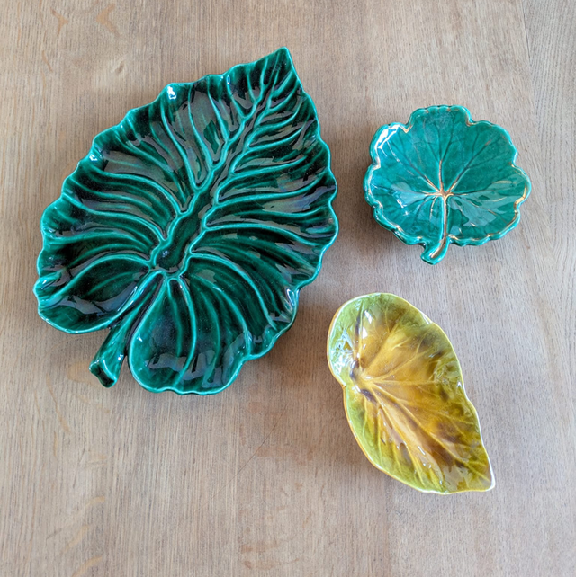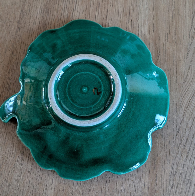 Petit plat en forme de feuille vert foncé avec un petit liseré doré légèrement passé mais encore visible par endroit tout le charme de l’ancien.