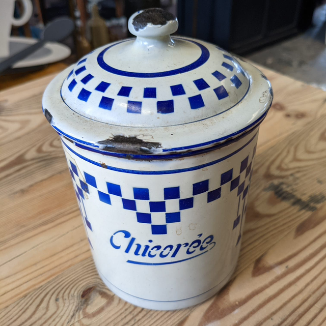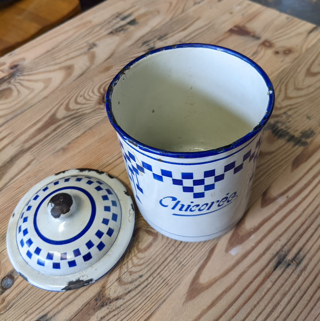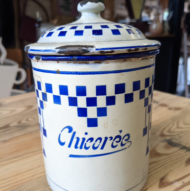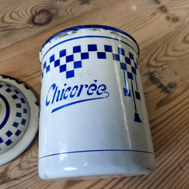 Ancien pot à épices en tôle emaillée Chicorée au décor Lustucru.