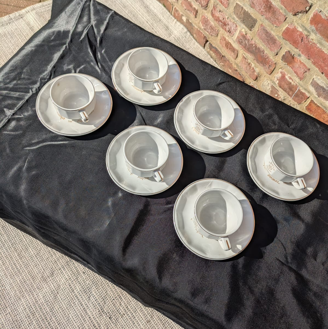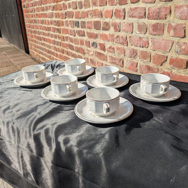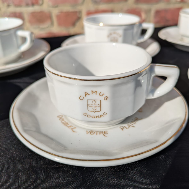 Ensemble de tasses publicitaires de thé (où café) avec sous tasses inscription « camus cognac »