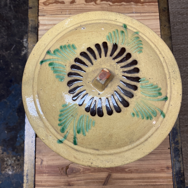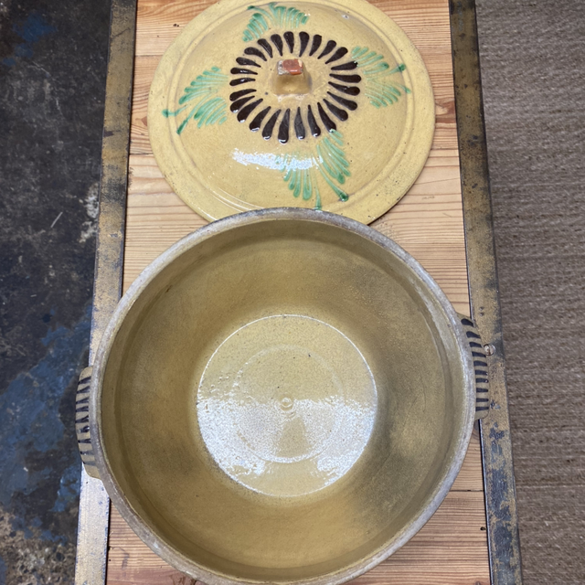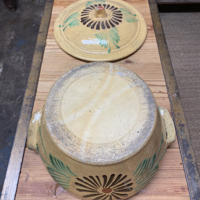 Grosse soupière en terre cuite, avec coucercle et 2 anses.