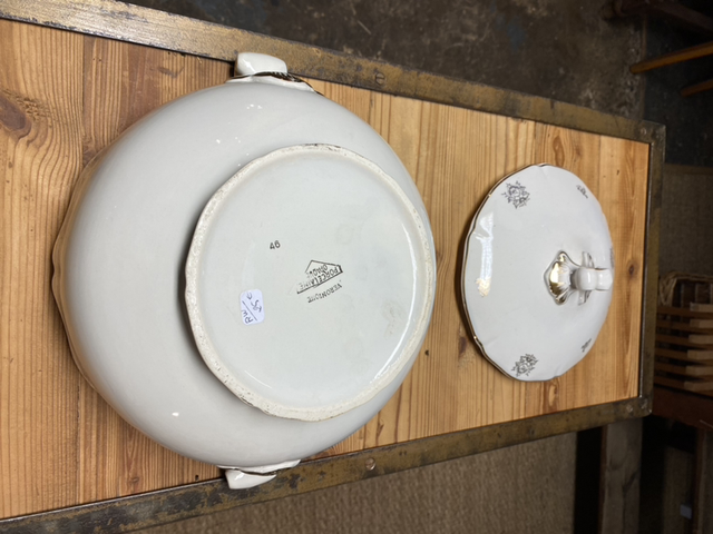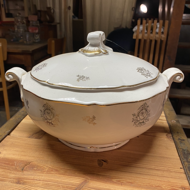 Soupière avec couvercle avec une liseré doré.