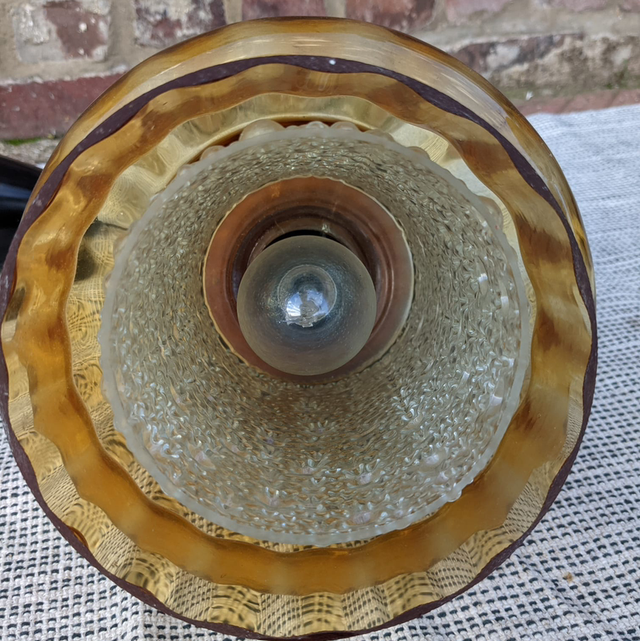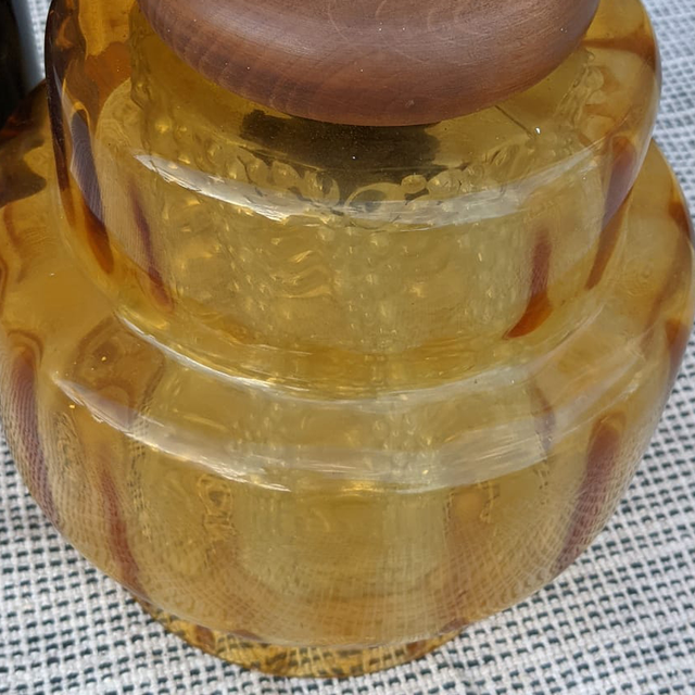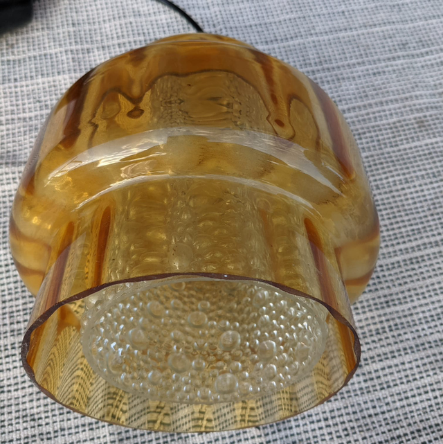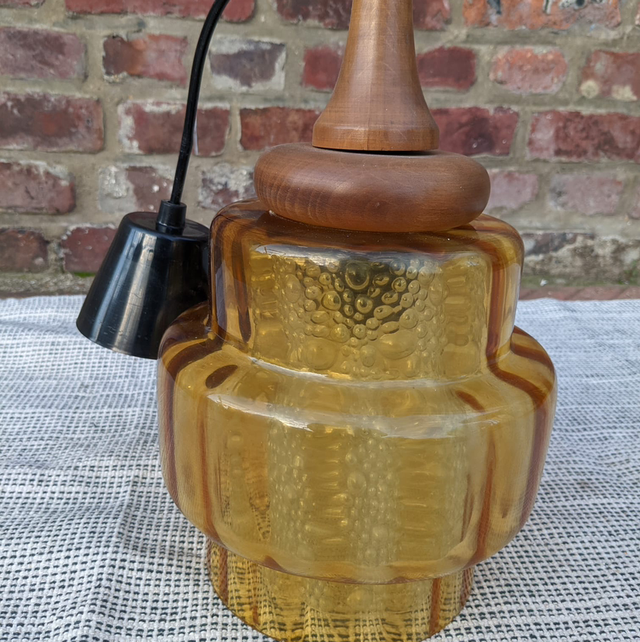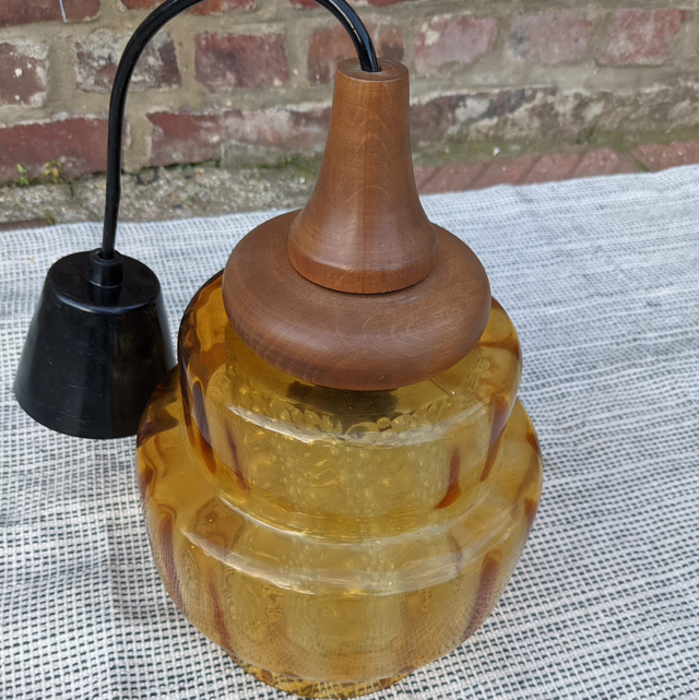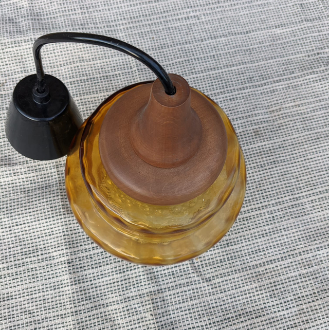 Tres jolie suspension scandinave des années 60 en verre fumée jaune et en teck de Carl fagerlund pour orrefors.
