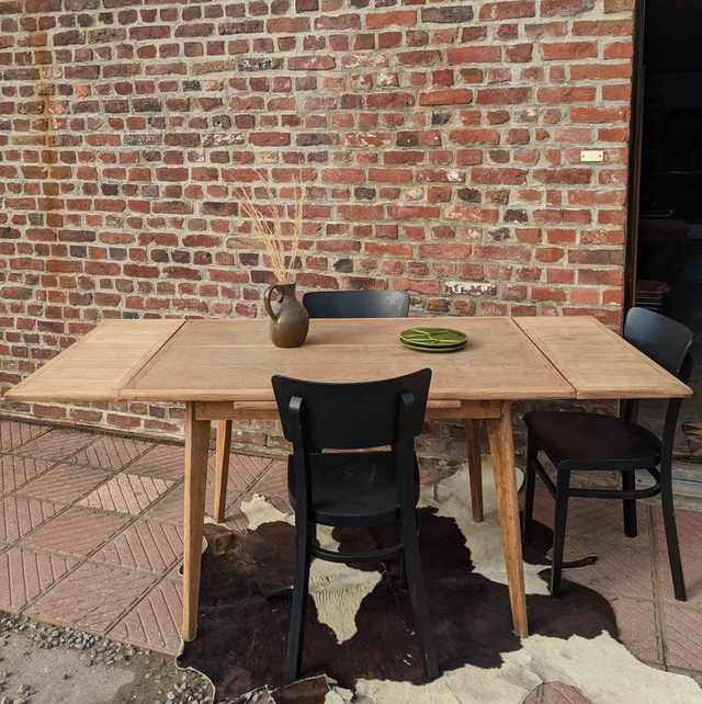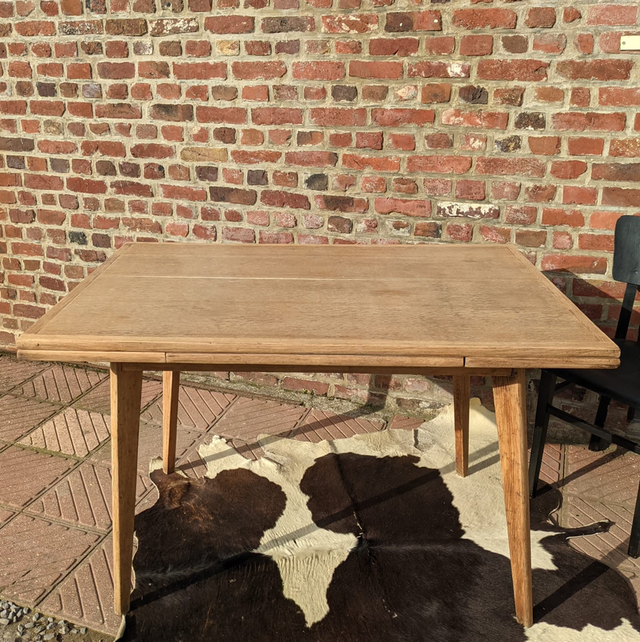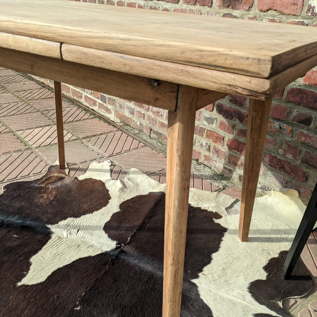 il y a un système de rallonges de chaque côté à glisser sous le plateau de la table très pratique lors de repas conviviaux avec plusieurs personnes. Cette table a été entièrement restaurée dans notre atelier afin de lui redonner une seconde vie.