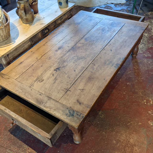 Table basse en chêne, pieds tournés et 2 tiroirs de chaque côté.