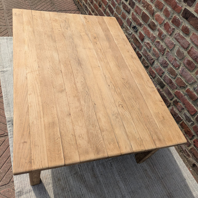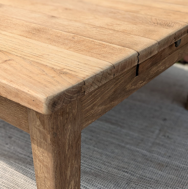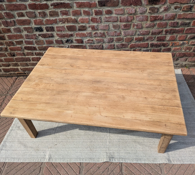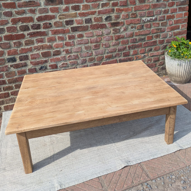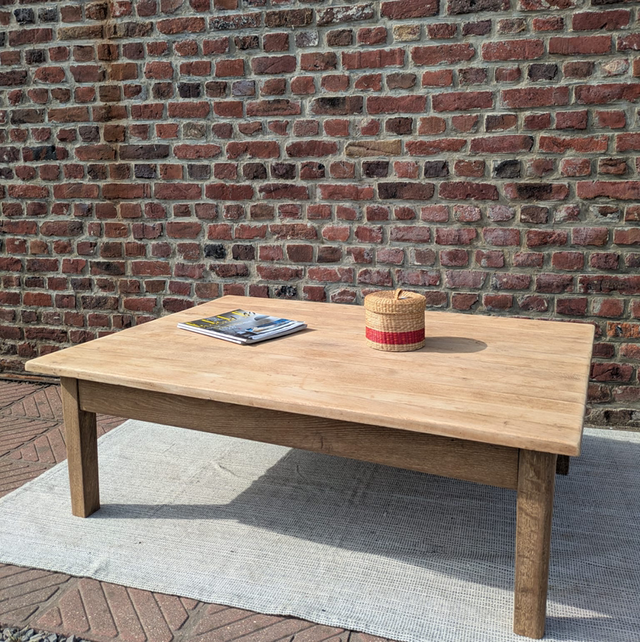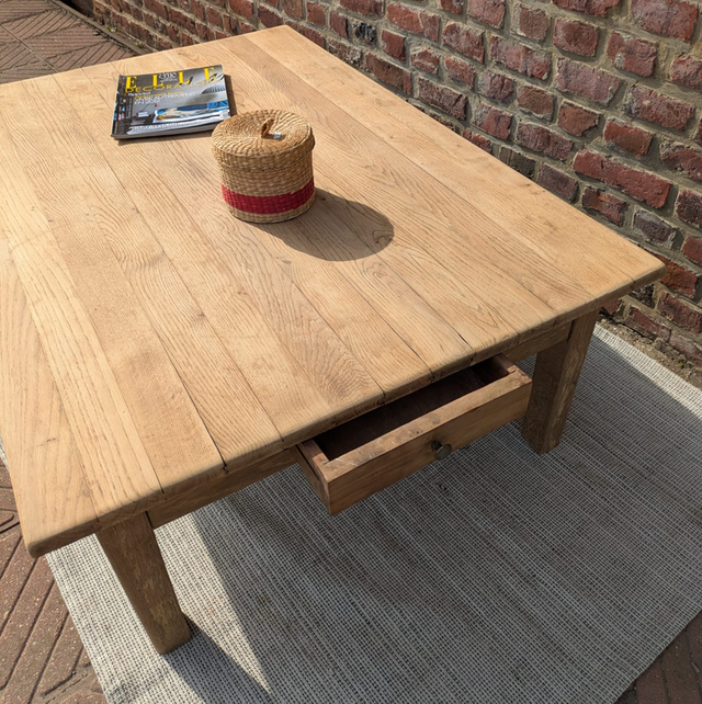 Très belle table basse en bois de chêne massif avec tiroir sur le côté. Cette table aux dimensions atypiques a été totalement travaillée dans notre atelier afin de lui redonner une seconde vie, le plateau n’est pas d’origine mais ancien a été restauré. Le pied est un pied de ferme très simple mais chic et sobre et peut se marier avec tout style.