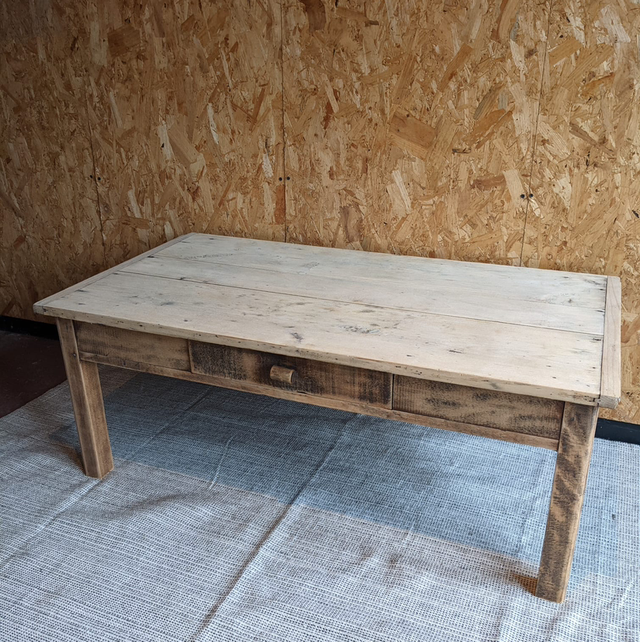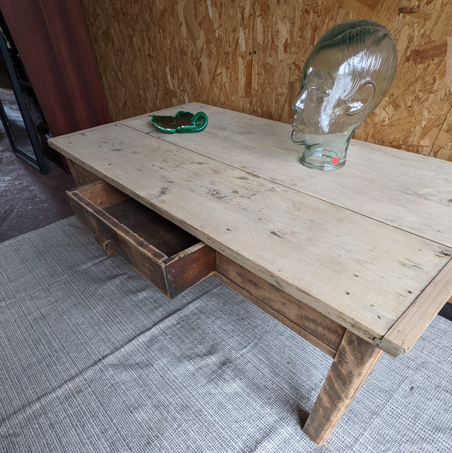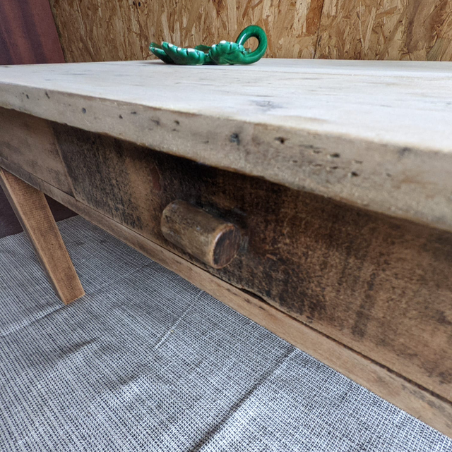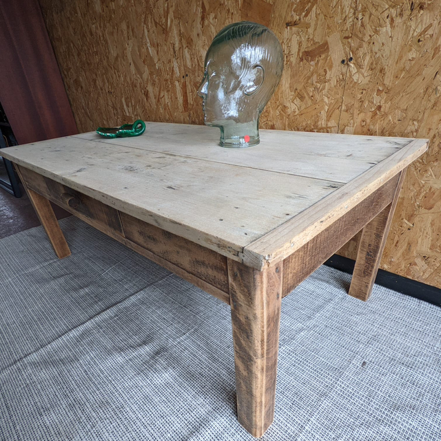 Jolie table basse avec une plateau en peuplier et des pieds en chêne.