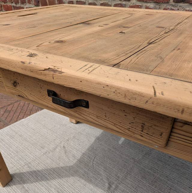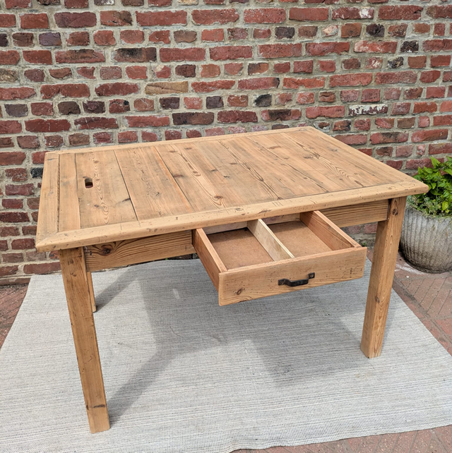 Table d’atelier pouvant servir de bureau. Cette table a été entièrement restaurée dans notre atelier avec une planche intégrée ancienne.