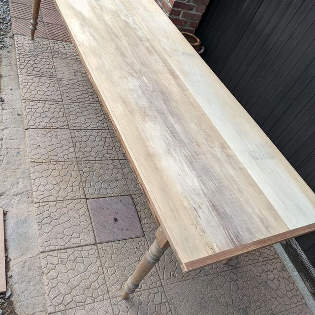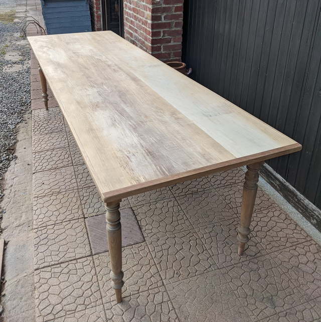 Cette table a été créée de toutes pièces dans notre atelier. Nous avons repris les pieds d’une table existante, travaillé la patine, ensuite nous lui avons mis un plateau unique et créé les bandeaux sous plateau. Le plateau est en peuplier bordé de chêne et ses pieds sont en merisier.