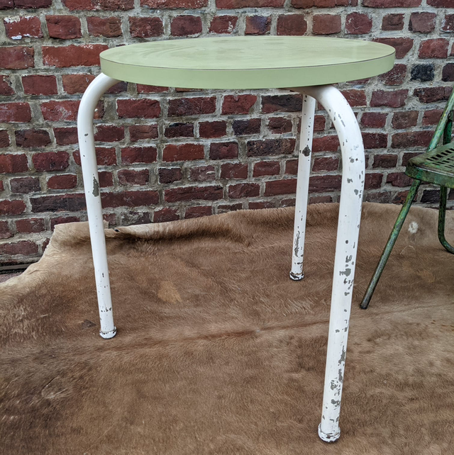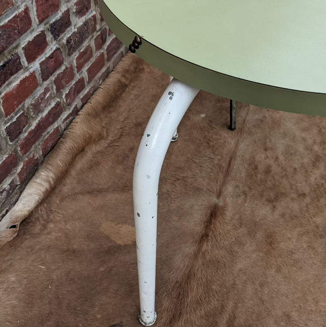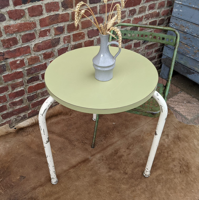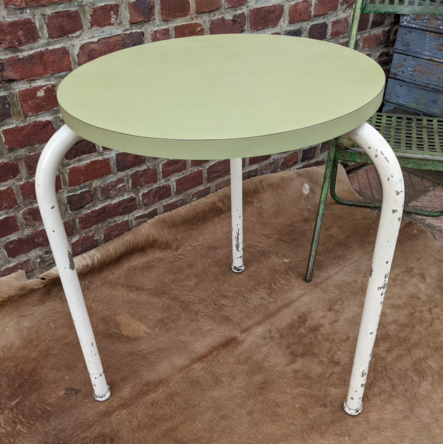 Adorable petite table d’appoint ronde, au charme délicieusement rétro, composée d’un plateau en Formica vert et d’un pied en métal patiné blanc. Son style typique du milieu du XXᵉ siècle apporte une touche vintage pleine de fraîcheur, idéale dans une décoration années 50, brocante chic ou intérieure colorée. Compacte et légère, elle se place facilement près d’un canapé, en bout de fauteuil ou en table de chevet.
