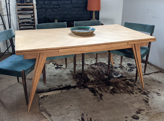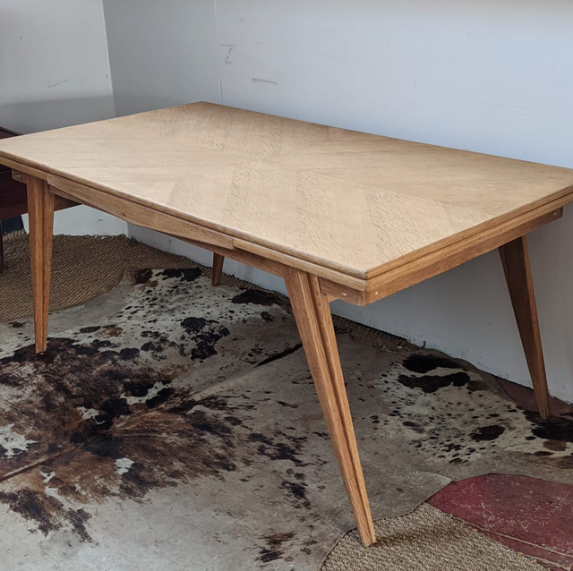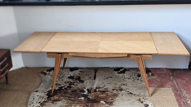 Très belle table années 50 plaquage chêne avec pieds fuseaux et 2 rallonges à chaque extrémité de celle ci.