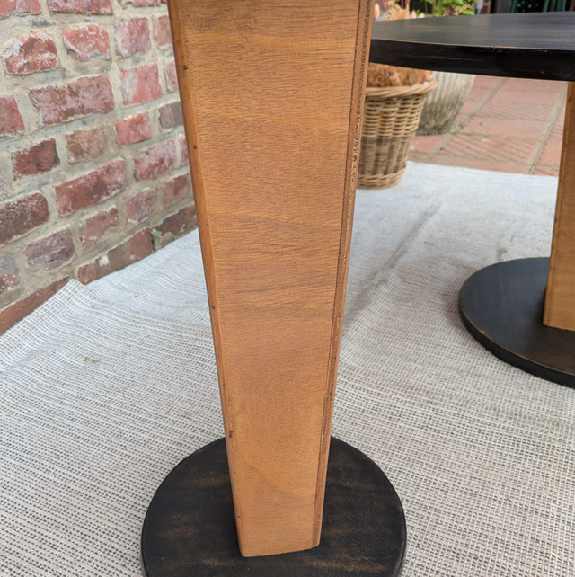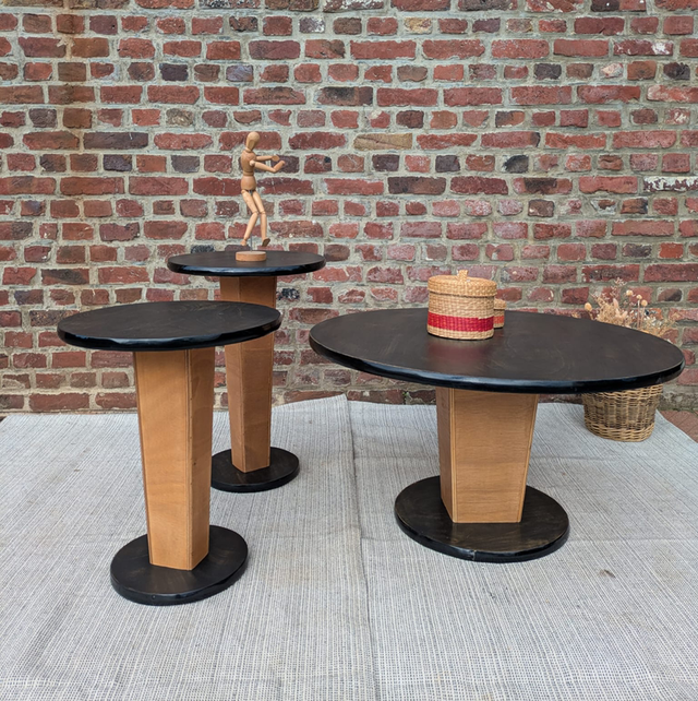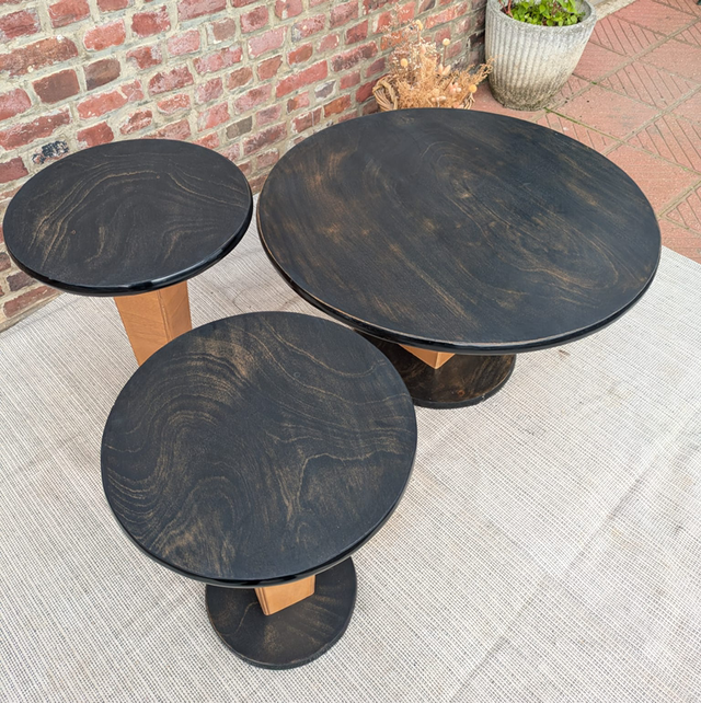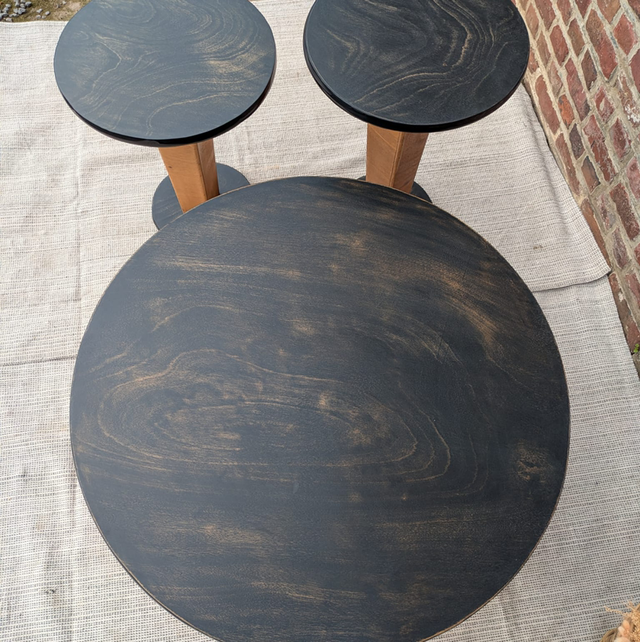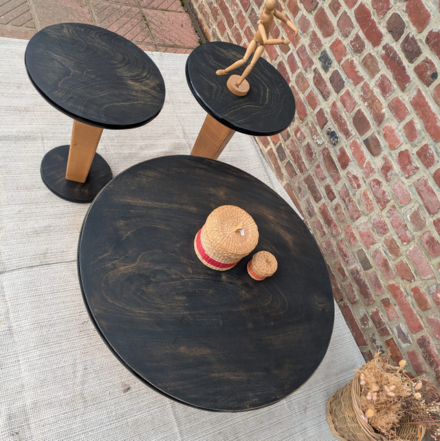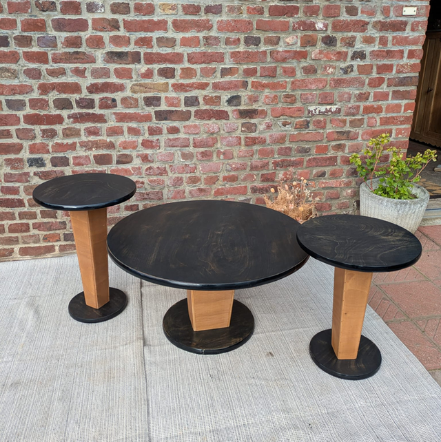 Charmant trio de tables basses rondes en bois, entièrement fabriquées et transformées à la main, offrant un ensemble à la fois décoratif, pratique et unique.