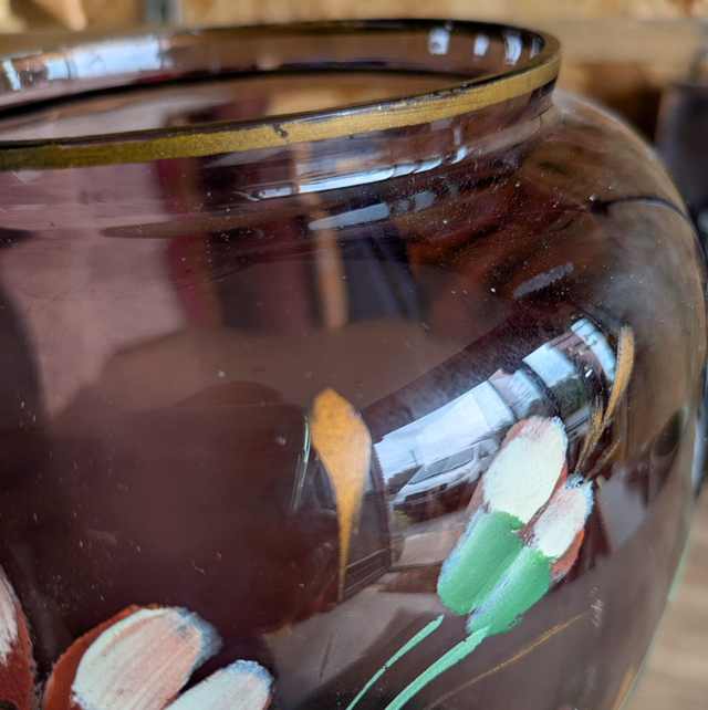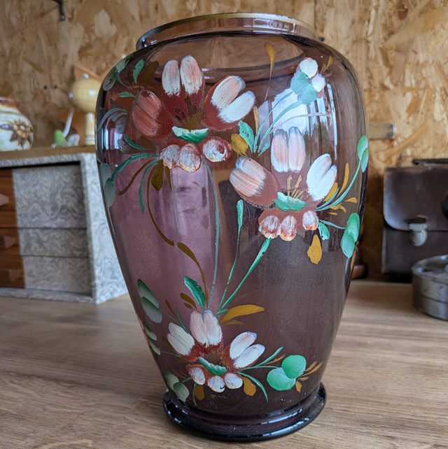 Vase en verre fumé avec fleurs peintes