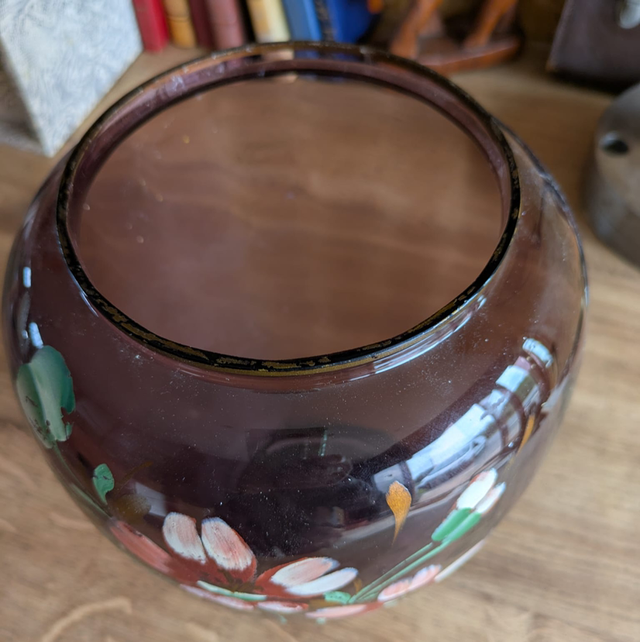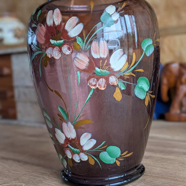Joli vase en verre fumé transparent de couleur marron violine, avec de petites fleurs peintes à la main dessus.