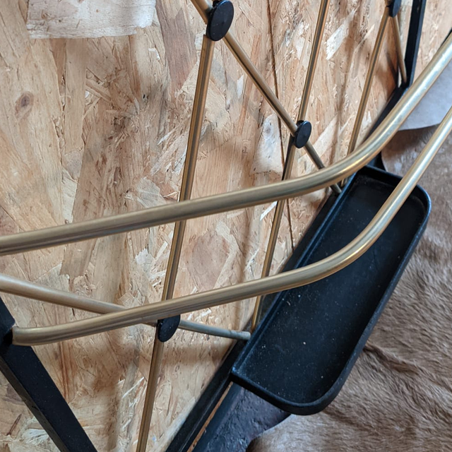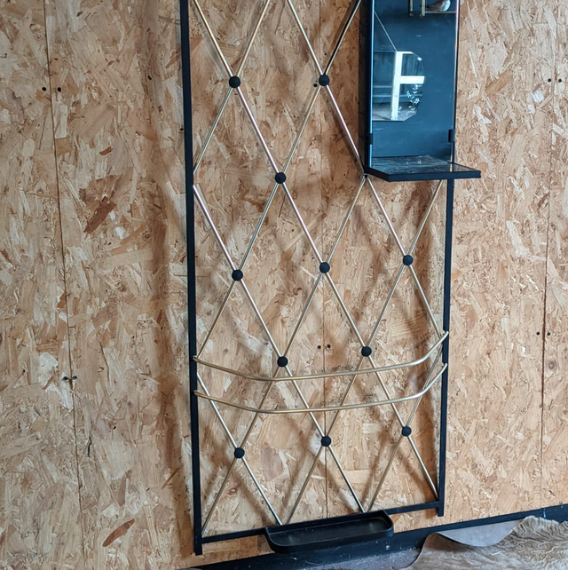 Une étagère en haut avec tubes dorés, pour poser sacs, chapeaux, bonnets, petites valises.