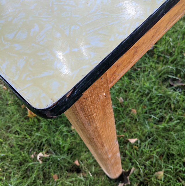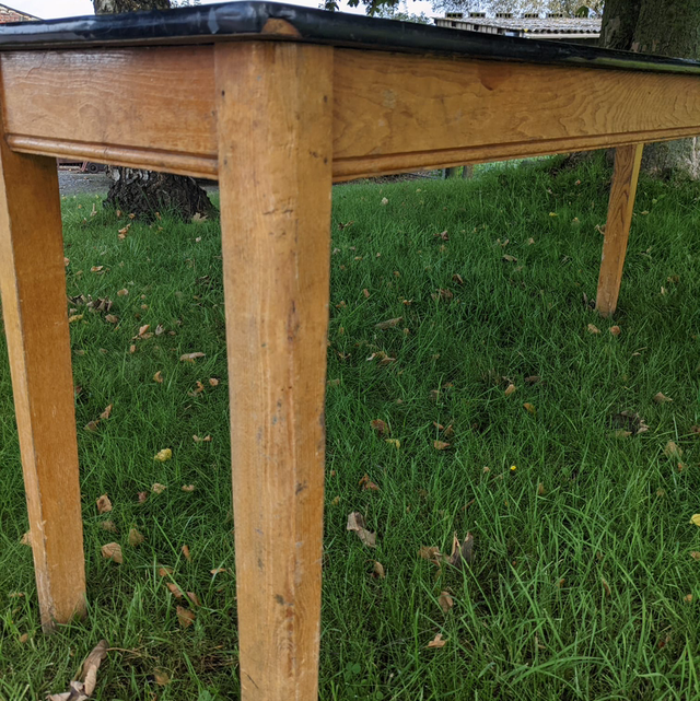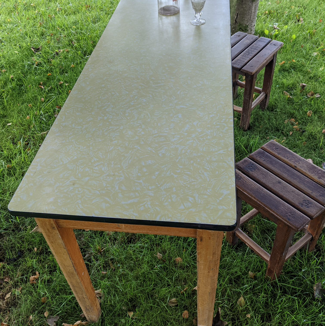 longue table bistrot des années 50 avec un plateau en Formica jaune cerclage noir.